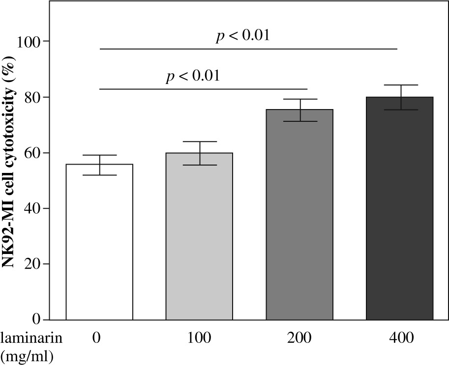 Effects of laminarin on NK92-MI cells cytotoxicity are shown in Figure 3. Compared to the control group, 200 mg/ml and 400 mg/ml laminarin both increased the NK92-MI cell cytotoxicity significantly (p < 0.01).