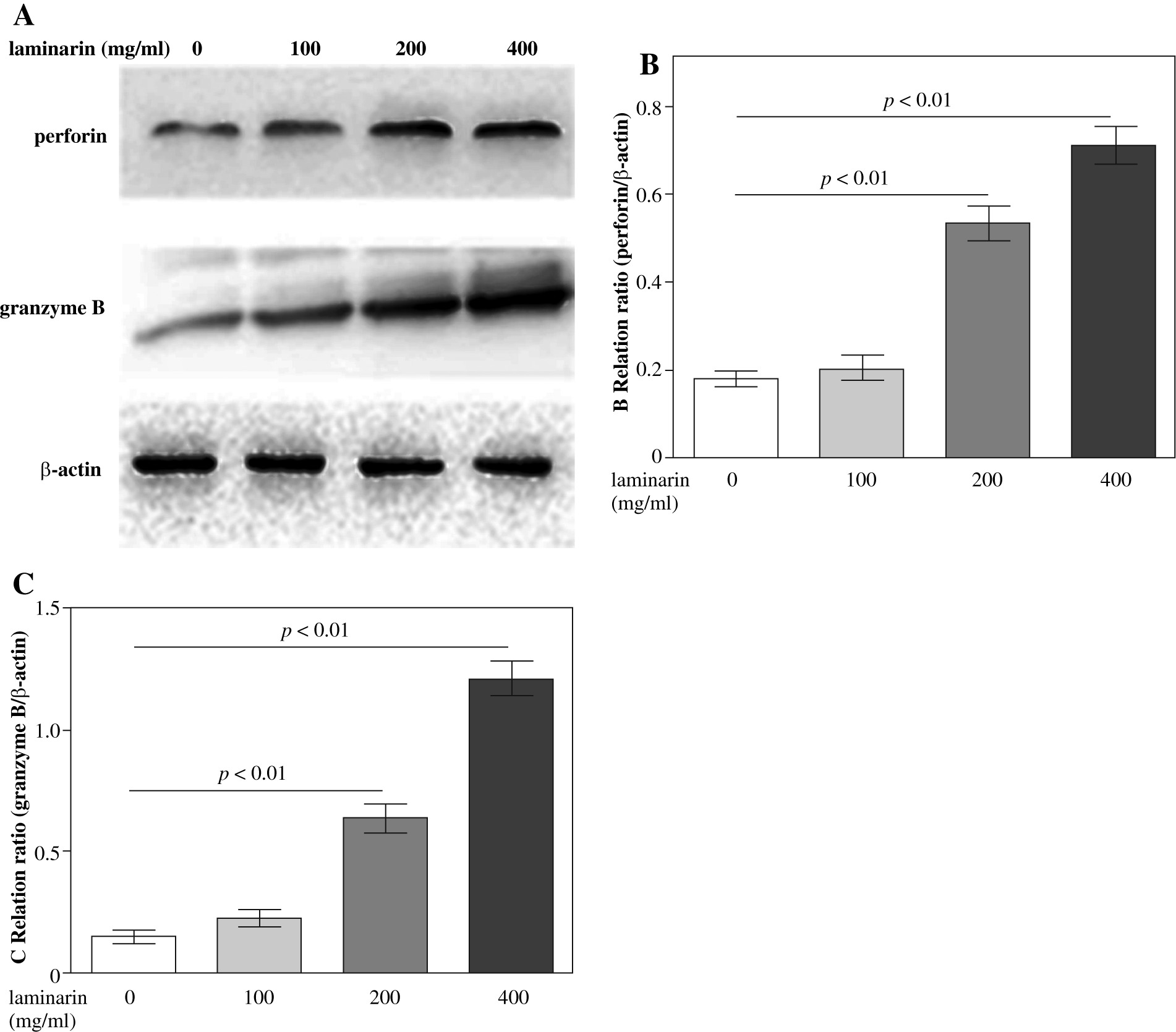 Compared to the normal control group, 200 µg/ml and 400 µg/ml laminarin increased the cytotoxicity and expression of perforin and granzyme significantly. This showed that the mechanism of promotion of NK cell cytotoxicity of laminarin may be related to the ability of laminarin to promote the expression and release of perforin and granzyme.