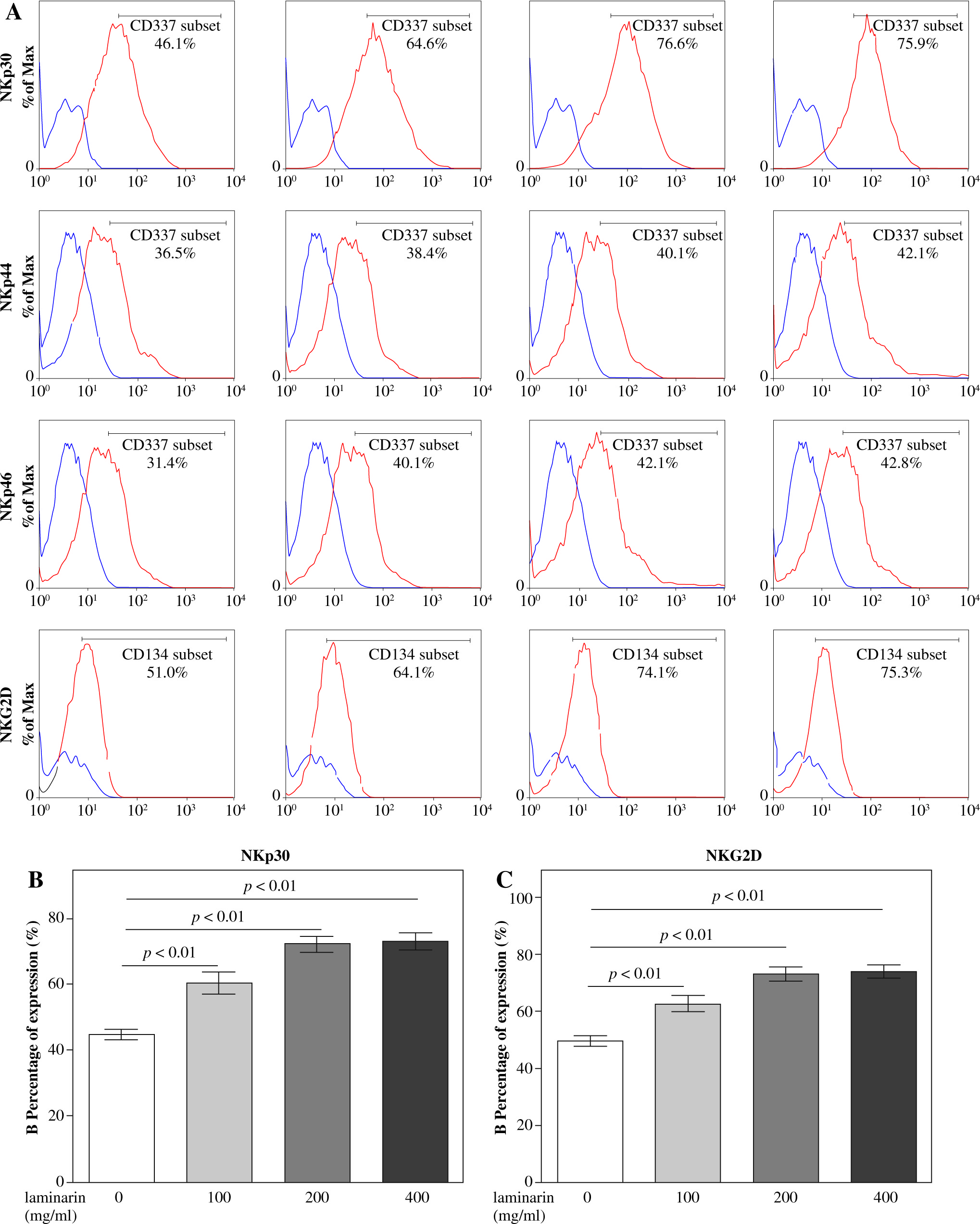 Natural cytotoxicity receptors are receptors that mediate NK cell activation and found only on NK cells. Their surface density is correlated with the magnitude of NK cytotoxicity against target cells [32]. Cytotoxicity against most target cells requires the participation of a combination of activating receptors [33]. In this report, we provide experimental evidence that the expression and function of activating receptors in NK-mediated killing are regulated by laminarin. We showed that laminarin upregulated the expression of NKp30 and NKG2D. These results suggest that laminarin-stimulated cytotoxicity of NK92-MI cells against K562 cells may depend on upregulation of NKp30 and NKG2D.