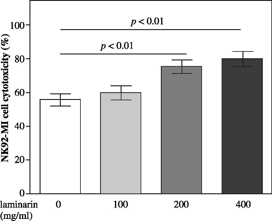 Effects of laminarin on NK92-MI cells cytotoxicity are shown in Figure 3. Compared to the control group, 200 mg/ml and 400 mg/ml laminarin both increased the NK92-MI cell cytotoxicity significantly (p < 0.01).