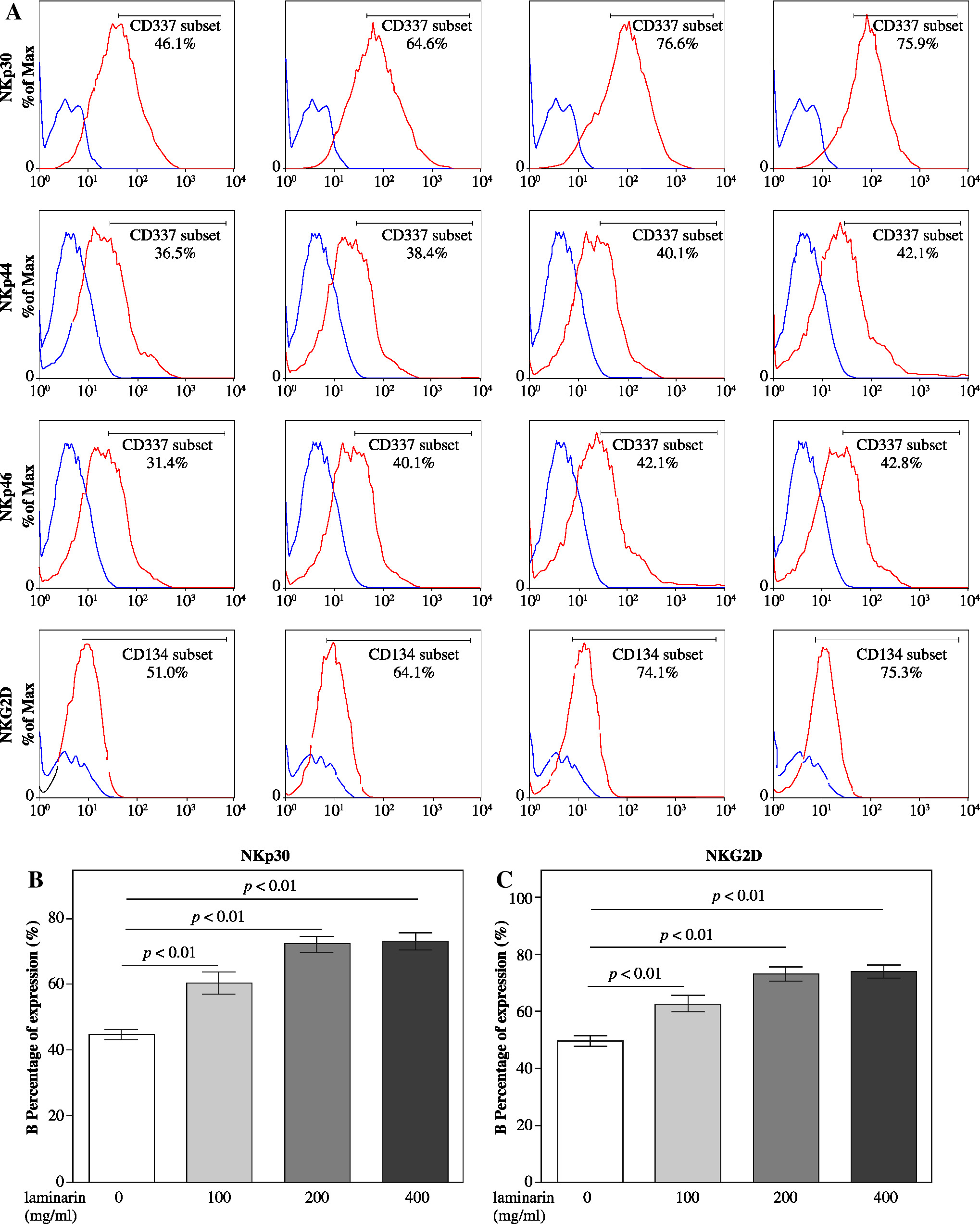 Effects on expression of activating receptors on NK92-MI cells of laminarin are shown in Figure 5. Compared to the control group, 100 µg/ml, 200 µg/ml and 400 µg/ml laminarin all increased NKp30 and NKG2D expression on NK92-MI cells significantly (p < 0.01).