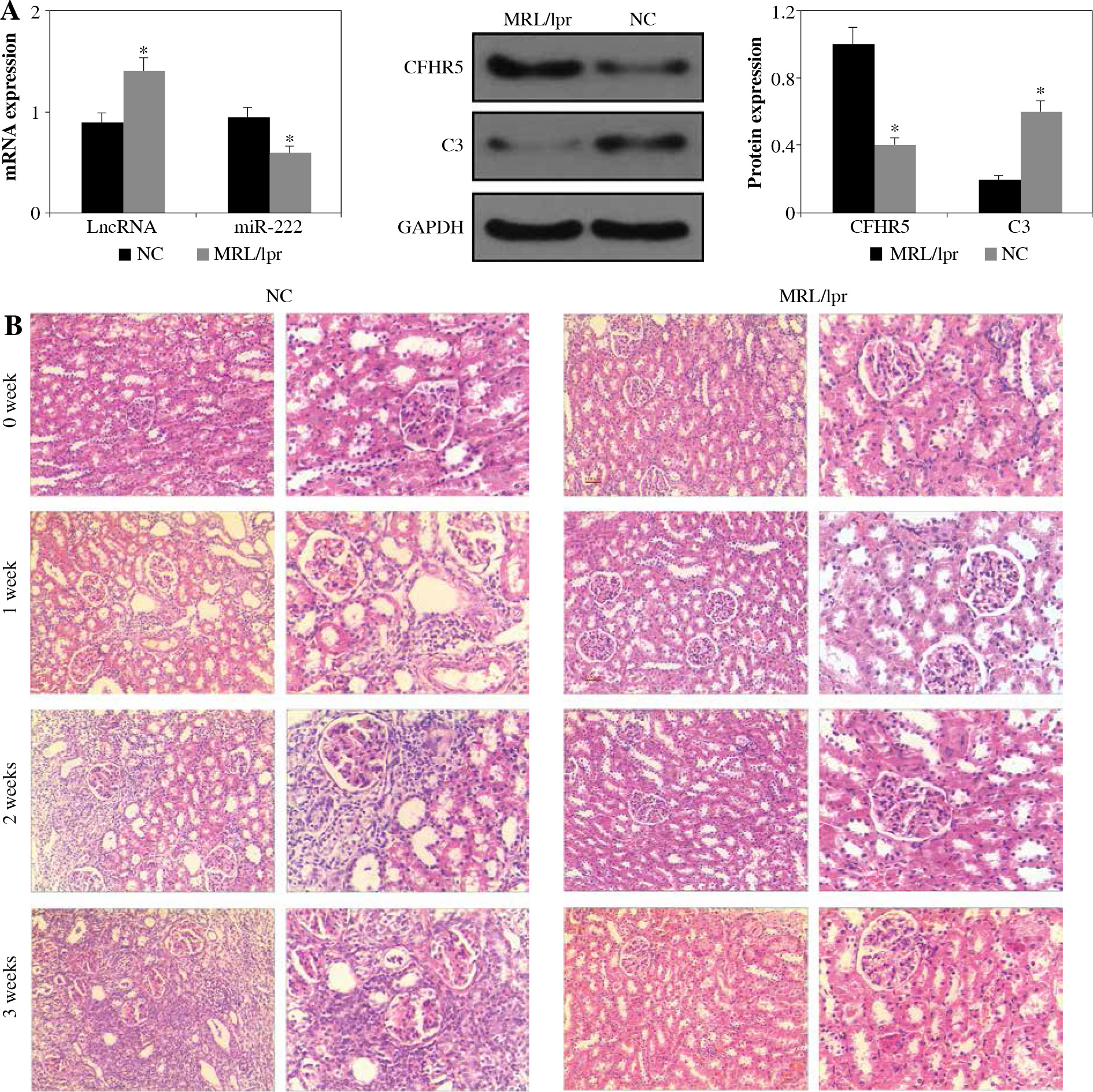 A) LncRNA MIAT, miR-222, CFHR5, and C3 expression in the MRL/lpr group and MRL/MPJ control group. Data are expressed as mean ± SEM. *p < 0.05. B) H&E staining in kidney tissues of the MRL/lpr group and control MRL/MPJ group