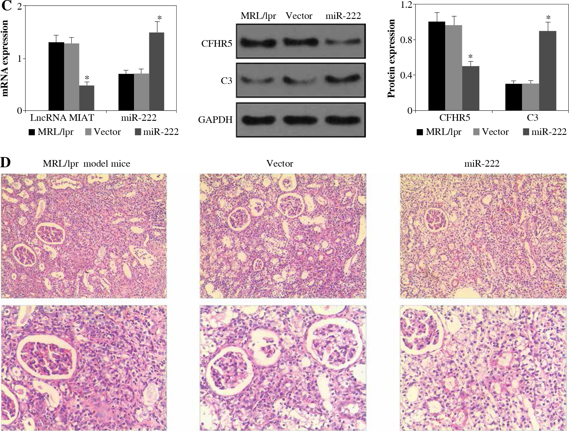A) LncRNA MIAT, miR-222, CFHR5, and C3 expressions in MRL/lpr group, no-load vector group and lncRNA MIAT treatment group. Data were expressed as mean ± SEM. *p < 0.05. B) H&E staining in kidneys of the MRL/lpr group, no-load vector group and lncRNA MIAT treatment group C) LncRNA MIAT, miR-222, CFHR5, and C3 expression in MRL/lpr group, no-load vector group and miR-222 treatment group. Data are expressed as mean ± SEM.*p < 0.05. D) H&E staining in kidneys of the MRL/lpr group, no-load vector group and miR-222 treatment group