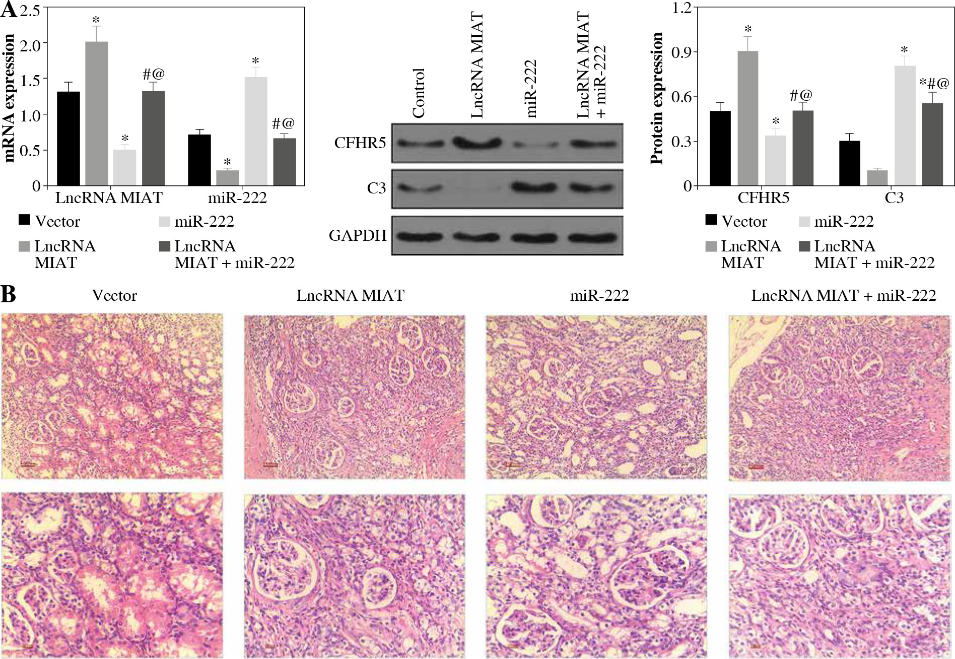 A) LncRNA MIAT, miR-222, CFHR5, and C3 expressions in no-load vector group, lncRNA MIAT treatment group, miR-222 treatment group and lncRNA MIAT + miR-222 treatment group. Data are expressed as mean ± SEM. *p < 0.05 compared to the control, #p < 0.05 compared to lncRNA MIAT, @p < 0.05 compared to miR-222. B) H&E staining in kidneys of the no-load vector group, lncRNA MIAT treatment group, miR-222 treatment group and lncRNA MIAT + miR-222 treatment group