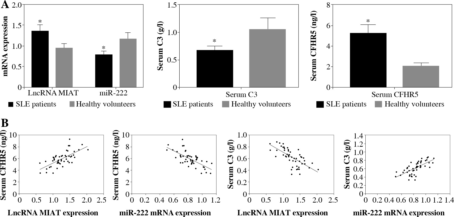 A) mRNA expression of lncRNA MIAT and miR-222, and CFHR5 and C3 serum levels in patients with SLE and healthy controls. *p < 0.05 compared to healthy controls. B) Correlation analysis between lncRNA MIAT, miR-222, CFHR5, and C3. A positive correlation was observed between lncRNA MIAT and CFHR5, a negative correlation between miR-222 and CFHR5, a positive correlation between lncRNA MIAT and C3, and a negative correlation between miR-222 and C3 in patients with SLE