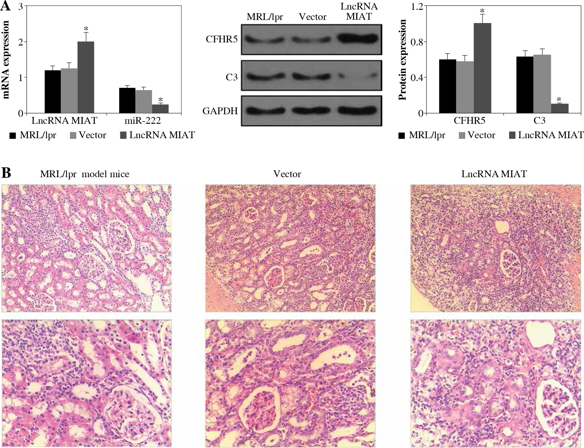 A) LncRNA MIAT, miR-222, CFHR5, and C3 expression in the MRL/lpr group and MRL/MPJ control group. Data are expressed as mean ± SEM. *p < 0.05. B) H&E staining in kidney tissues of the MRL/lpr group and control MRL/MPJ group