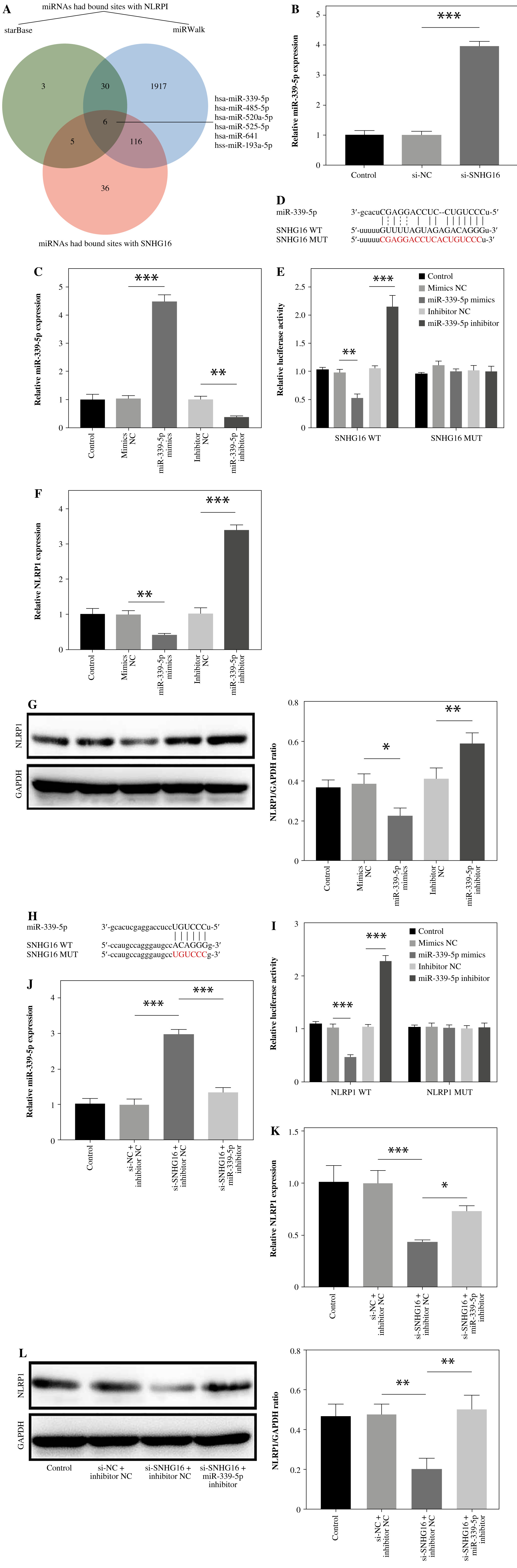SNHG16 positively regulated NLRP1 expression through miR-339-5p sponging. A) The starBase and miRWalk databases were used to explore miRNAs that shared common binding sites with SNHG16 and NLRP1. B) The expression of miR-339-5p in BEAS-2B cells was investigated by RT-qPCR after si-NC or si-SNHG16 transfection. BEAS-2B cells were transfected with NC mimics, miR-339-5p mimics, inhibitor NC, or miR-339-5p inhibitor. C) The expression of miR-339-5p in BEAS- 2B cells was examined via RT-qPCR. D) The binding sites among SNHG16 and miR-339-5p were tested by the starBase database. E) The dual luciferase assay was performed to investigate luciferase activity. F) NLRP1 expression in BEAS-2B cells was examined via RT-qPCR and western blotting. n = 3 per group. *p < 0.05, **p < 0.01, ***p < 0.001 G) NLRP1 expression in BEAS-2B cells was examined via RT-qPCR and western blotting. H) The binding sites between NLRP1 and miR-339-5p were predicted by the starBase database. I) The dual luciferase assay was performed to measure luciferase activity. Cells were treated with inhibitor NC + si-NC, si-SNHG16 + NC inhibitor, or si-SNHG16 + miR-339-5p inhibitor. J, K) Levels of miR-339-5p and NLRP1 were examined via RT-qPCR. n = 3 per group. *p < 0.05, **p < 0.01, ***p < 0.001. L) NLRP1 expression in BEAS-2B cells was tested by western blotting. n = 3 per group. *p < 0.05, **p < 0.01, ***p < 0.001