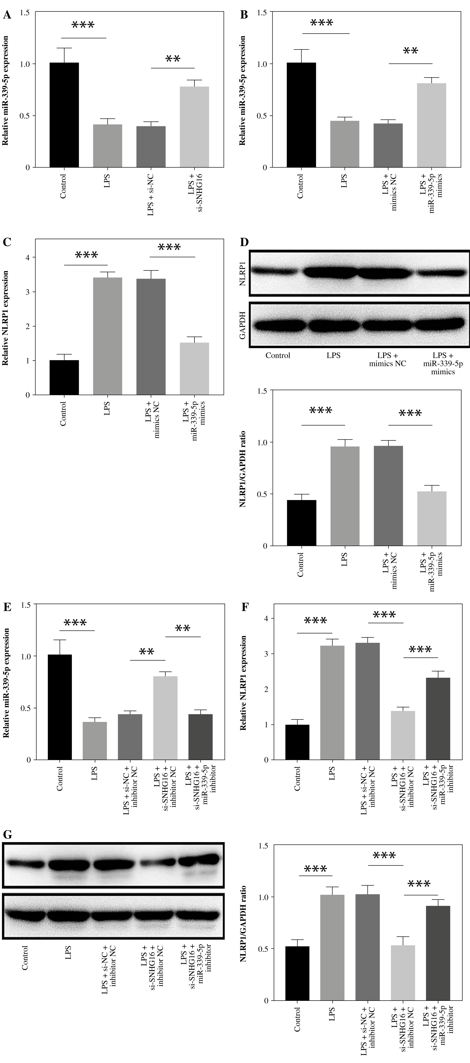 To verify the relationship between SNHG16 and miR-339-5p, cells were transfected with si-SNHG16 or miR-339-5p mimics. As shown in Figure 3A, B, LPS-induced miR-339-5p downregulation in BEAS-2B cells was reversed by SNHG16 silencing or miR-339-5p mimics. In contrast, LPS-upregulated NLRP1 was significantly attenuated by miR-339-5p mimics (Fig. 3C, D). SNHG16 siRNA-mediated regulation of miR-339-5p and NLRP1 was significantly abolished by miR-339-5p inhibitor (Fig. 3E-G). Taken together, SNHG16 increased the level of NLRP1 through miR-339-5p downregulation in LPS- induced BEAS-2B cells.