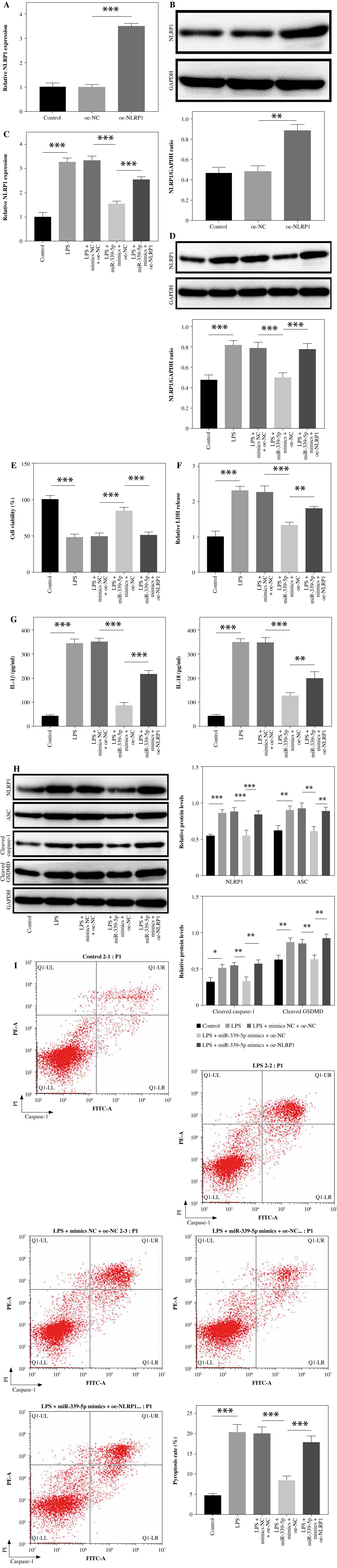 NLRP1 reversed miR-339-5p overexpression-mediated pyroptosis inhibition in LPS-induced BEAS-2B cells. A, B) The overexpression effect of NLRP1 was tested by RT-qPCR and western blotting after transfection with oe-NLRP1. BEAS-2B cells were exposed to LPS, LPS + mimics NC + pcDNA3.1, LPS + miR-339-5p mimics + pcDNA3.1, or LPS + miR-339-5p mimics + pcDNA3.1-NLRP1. C, D) NLRP1 levels in BEAS-2B cells were tested by RT-qPCR and western blotting. n = 3 per group. *p < 0.05, **p < 0.01, ***p < 0.001. E) BEAS-2B cell viability was assessed by the CCK-8 assay. F) LDH release was tested using the LDH kit. G) IL-18 and IL-1β levels in cell supernatants were tested by ELISA. n = 3 per group. *p < 0.05, **p < 0.01, ***p < 0.001. H) Protein levels of ASC, cleaved caspase-1, and cleaved GSDMD in BEAS-2B cells were detected by western blotting. I) BEAS-2B cell pyroptosis was determined by flow cytometry. n = 3 per group. *p < 0.05, **p < 0.01, ***p < 0.001. I) BEAS-2B cell pyroptosis was determined by flow cytometry. n = 3 per group. *p < 0.05, **p < 0.01, ***p < 0.001