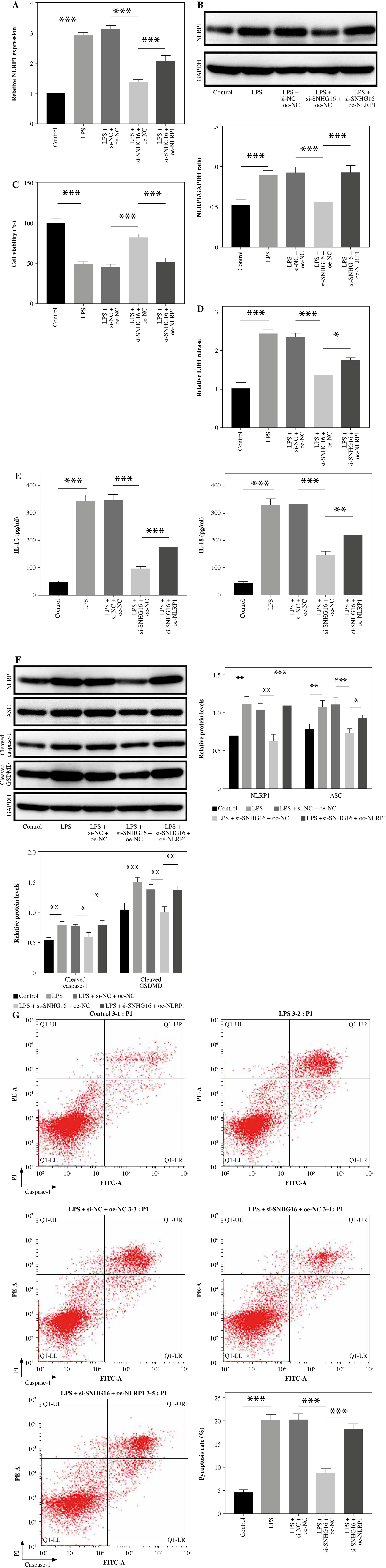 NLRP1 upregulation abolished SNHG16 knockdown-reduced pyroptosis. BEAS2B cells were transfected with LPS, si-NC + LPS + pcDNA3.1, LPS + si-SNHG16 + pcDNA3.1, or LPS + si-SNHG16 + pcDNA3.1-NLRP1. A, B) NLRP1 levels in BEAS-2B cells were tested by RT-qPCR and western blotting. C) BEAS-2B cell viability was assessed by the CCK-8 assay. D) The LDH kit was used to test for LDH release. n = 3 per group. *p < 0.05, **p < 0.01, ***p < 0.001. E) IL-1β and IL-18 levels in supernatants of BEAS-2B cells were tested by ELISA. F) Protein levels of ASC, cleaved caspase-1, and cleaved GSDMD in BEAS-2B cells were detected by western blotting. n = 3 per group. *p < 0.05, **p < 0.01, ***p < 0.001. G) BEAS-2B cell pyroptosis was determined by flow cytometry. n = 3 per group. *p < 0.05, **p < 0.01, ***p < 0.001 G) BEAS-2B cell pyroptosis was determined by flow cytometry. n = 3 per group. * p < 0.05, **p < 0.01, ***p < 0.001
