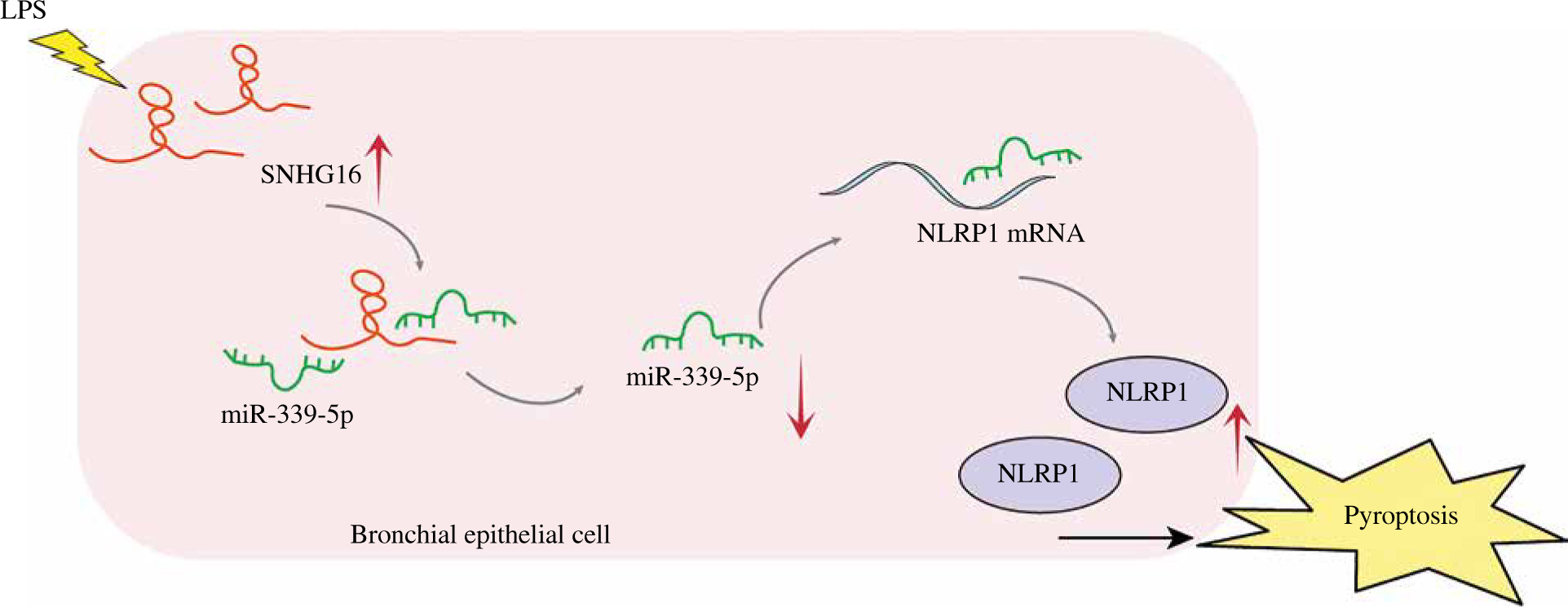 Sepsis, a condition induced by bacterial infection, is associated with high mortality rates. Without proper treatment, sepsis could cause multi-organ failure, tissue damage, and death [26, 27]. As a frequent complication of sepsis, ALI can lead to acute respiratory failure [28]. Therefore, it is essential to develop a therapeutic strategy against septic ALI. Pyroptosis can induce lung injury in sepsis. For example, Liu et al. found that the downregulation of STAT3 phosphorylation could inhibit pyroptosis to alleviate sepsis-induced ALI [29]; lncRNA NEAT1 regulated LPS-induced pyroptosis through ROCK1 mediation [14]. In this study, we found that SNHG16 facilitated LPS-induced bronchial epithelial cell pyroptosis through miR-339-5p/NLRP1 axis mediation, and this study might provide new evidence for increasing the clinical value of SNHG16 in ALI (Fig. 6).