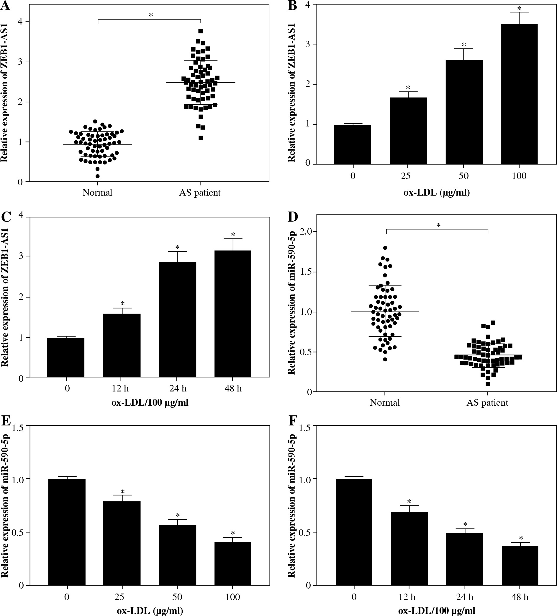 Expression of ZEB1-AS1 and miR-590-5p in the serum of AS patients and ox-LDL-treated HUVECs. A, D) The levels of ZEB1-AS1 and miR-590-5p were detected by qRT-PCR in AS patient serums. B) HUVECs were treated with 0, 25, 50, and 100 μg/ml ox-LDL for 24 h. C) HUVECs were treated with 100 μg/ml ox-LDL for 0, 12, 24, and 48 h. E, F) Ox-LDL treatment decreased miR-590-5p expression in a dose- or time-dependent manner. *p < 0.05