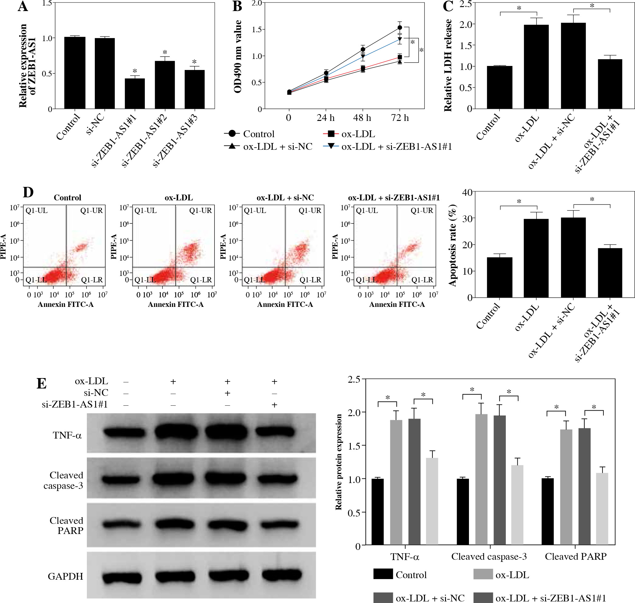 ZEB1-AS1 silencing promoted ox-LDL-treated endothelial cell proliferation and inhibited endothelial cell apoptosis. A) ZEB1-AS1 was silenced by transfection of specific ZEB1-AS1 siRNAs (si-ZEB1-AS1#1, si-ZEB1-AS1#2, and si-ZEB1-AS1#3). B, C) HUVECs (treated with ox-LDL or not) were transfected with si-NC or si-ZEB1-AS1#1. Cell viability (B) and LDH release (C) were measured by MTT assay and LDH Cytotoxicity Assay Kit, respectively. D) HUVEC apoptosis was detected after treatment with ox-LDL or knockdown of ZEB1-AS1 for 24 h. E) The protein levels of TNF-α, cleaved caspase-3, and cleaved PARP were measured in ox-LDL-induced HUVECs transfected with si-ZEB1-AS1#1. *p < 0.05