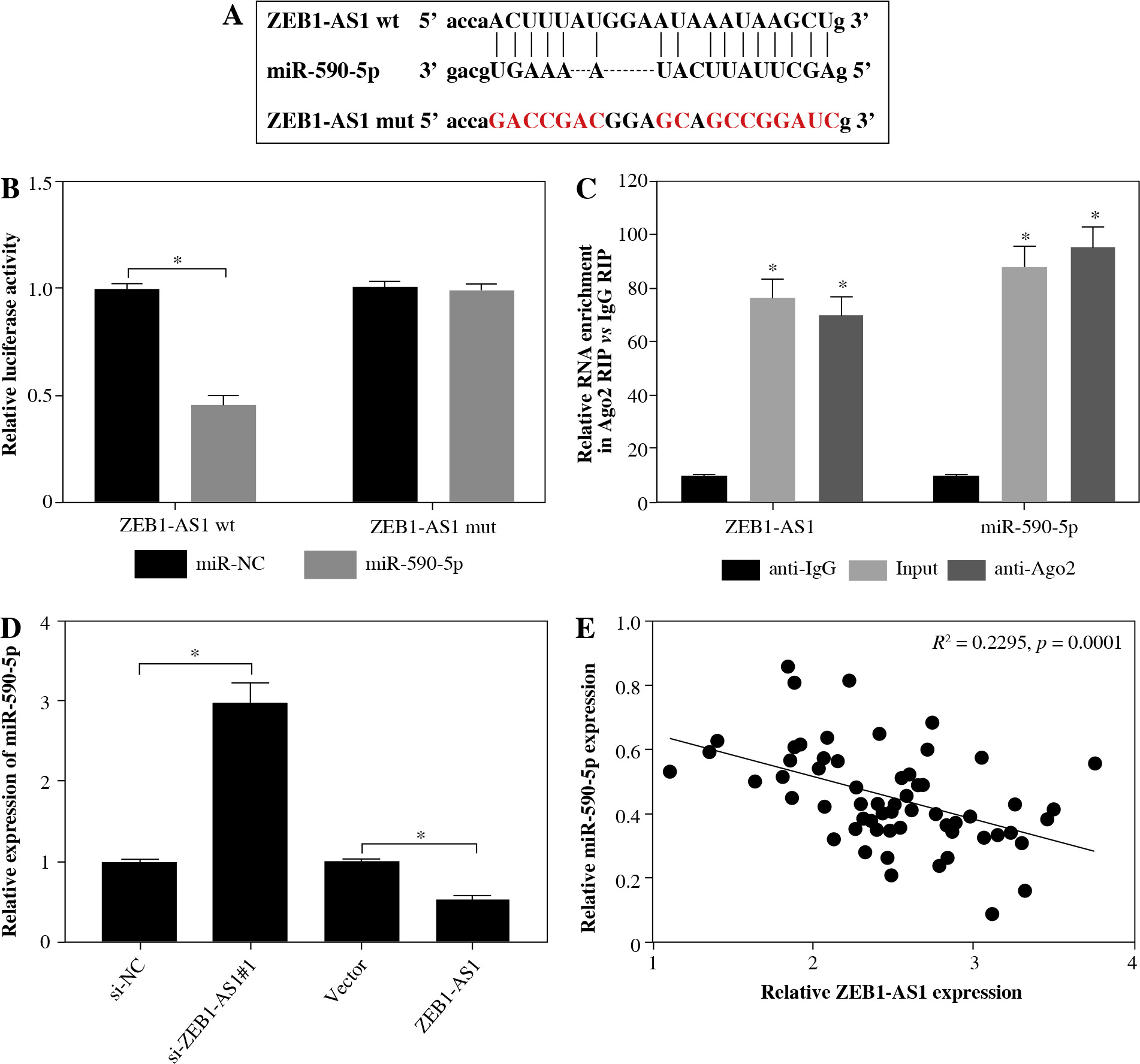 miR-590-5p is a direct target of ZEB1-AS1 in ox-LDL-treated HUVECs. A) The predicted binding sites of miR- 590-5p in ZEB1-AS1. B) Luciferase activity was detected in ox-LDL-treated HUVECs cotransfected with luciferase vectors containing ZEB1-AS1-wt or ZEB1-AS1-mut and miR-NC or miR-590-5p. C) RIP assay was conducted in ox- LDL-treated HUVECs extracts to examine miR-590-5p endogenously associated with ZEB1-AS1. D) The expression of miR-590-5p in ox-LDL-treated HUVECs transfected with si-NC, si-ZEB1-AS1#1, Vector or ZEB1-AS1 was detected by qRT-PCR assay. E) The negative correlation between ZEB1-AS1 and miR-590-5p in ox-LDL-treated HUVECs (R2 = 0.2295, p = 0.0001). *p < 0.05