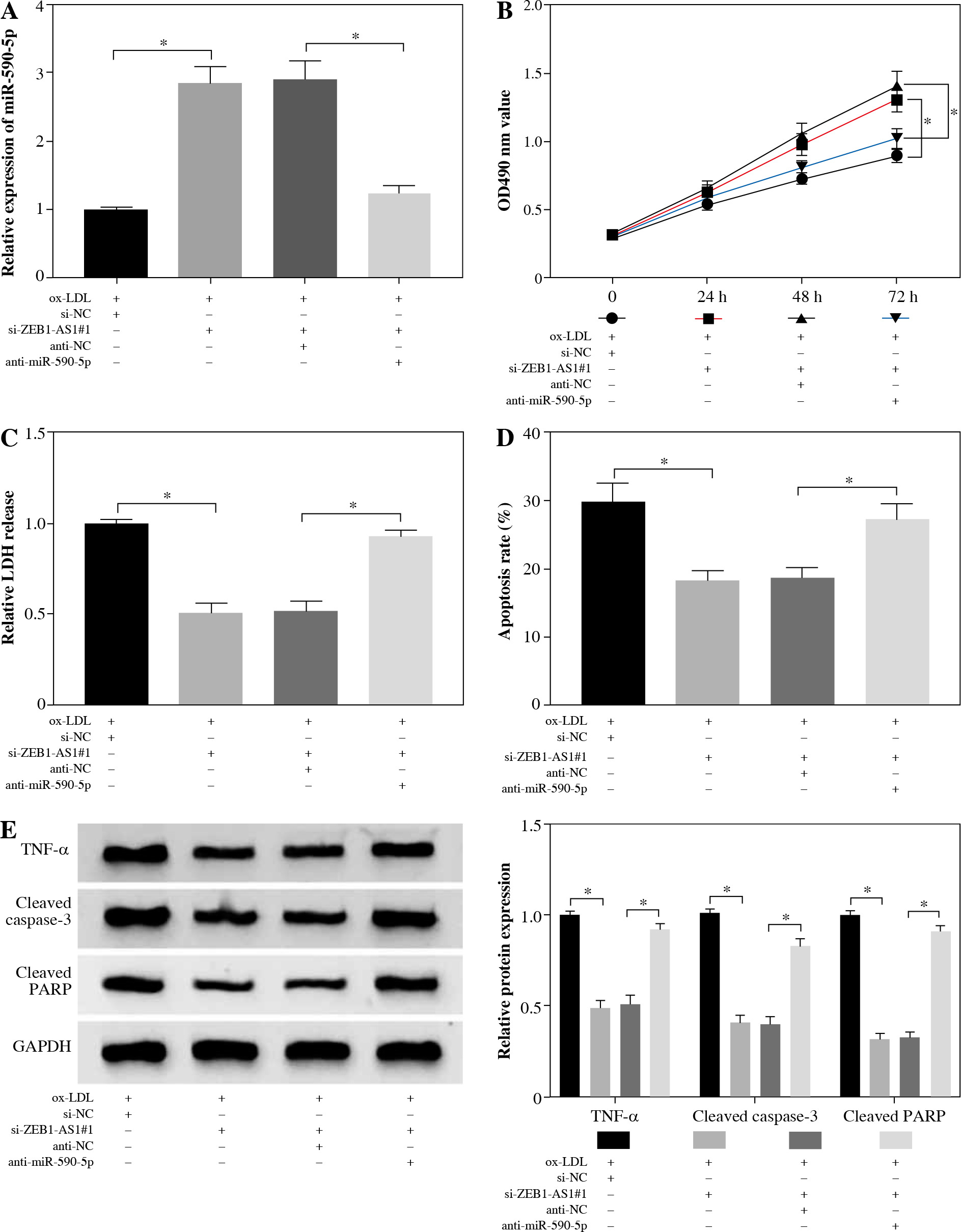 ZEB1-AS1 silencing attenuated ox-LDL-induced endothelial cell injury through regulation of miR-590-5p. After treatment with ox-LDL, the HUVECs were transfected with si-NC, si-ZEB1-AS1#1, anti-NC, or anti-miR-590-5p + si- ZEB1-AS1#1. A) The expression levels of miR-590-5p were detected by qRT-PCR. B) The viability of ox-LDL-induced HUVECs was detected at the indicated time points by MTT. C) Relative LDH release of ox-LDL-induced HUVECs was analysed by ELISA. D) The apoptosis of HUVECs were detected by using flow cytometry. E) The TNF-α, cleaved caspase-3, and cleaved PARP protein expressions were measured by western blot analysis. *p < 0.05