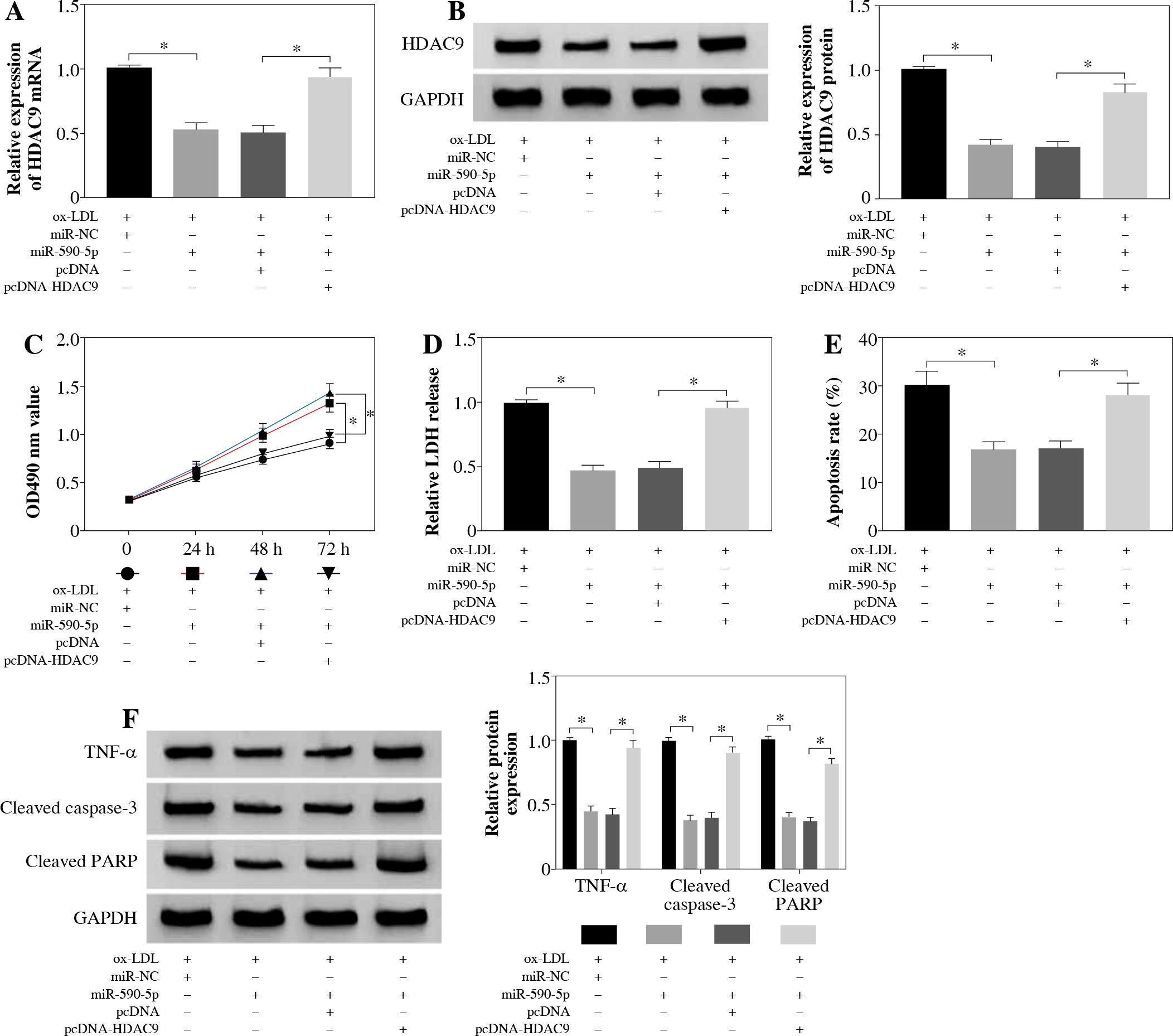 HDAC9 reversed the effect of miR-590-5p on proliferation and apoptosis of ox-LDL-induced endothelial cells. After treatment with ox-LDL, the HUVECs were transfected with miR-NC, miR-590-5p, pcDNA, or pcDNA-HDAC9. A, B) The expression levels of HDAC9 mRNA and protein were detected by qRT-PCR and western blot analysis, respectively. C, D) Cell viability and LDH release were measured by MTT assay and ELISA, respectively. E) HUVEC apoptosis was detected by using flow cytometry assay. F) The TNF-α, cleaved caspase-3, and cleaved PARP protein expression were measured by western blot analysis. *p < 0.05