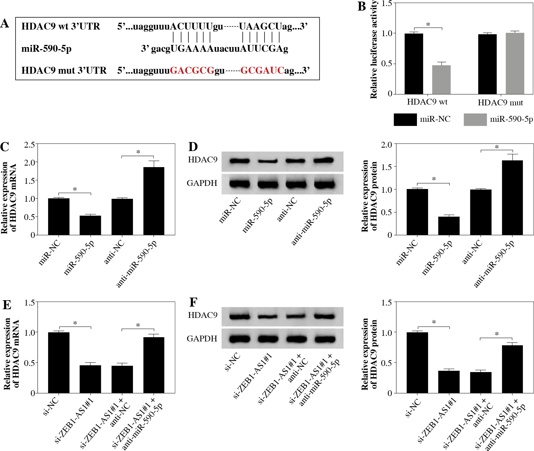 ZEB1-AS1 targeted miR-590-5p to regulate HDAC9 expression. A) The predicted binding sites of miR-590-5p in 3’-UTR of HDAC9. B) The wild-type or mutated HDAC9 3’-UTR reporter plasmids were co-transfected into ox-LDLinduced HUVECs with miR-NC or miR-590-5p, and then luciferase activity was detected. C, D) Expression levels of HDAC9 mRNA and protein were examined by qRT-PCR (C) and western blot (D) in ox-LDL-induced HUVECs treated with miR-NC, miR-590-5p, anti-NC, or anti-miR-590-5p, respectively. E, F) Expression levels of HDAC9 mRNA and protein were examined by qRT-PCR (E) and western blot (F) in ox-LDL-induced HUVECs treated with si-NC, si-ZEB1- AS1#1, si-ZEB1-AS1#1 + anti-NC, and si-ZEB1-AS1#1 + anti-miR-590-5p, respectively. *p < 0.05