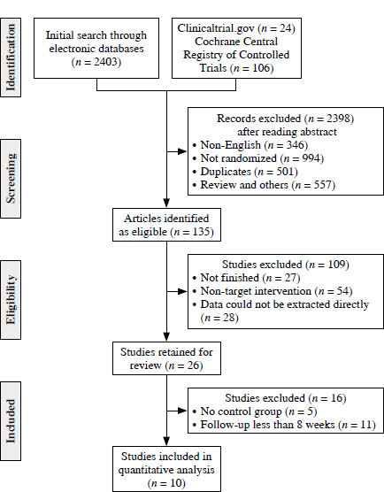 The electronic literature search yielded 2533 potentially relevant studies. Thorough assessment of titles and abstracts of 2398 articles yielded 557 reviews and references, 346 published in languages other than English, and 501 duplicates. One hundred and nine studies were excluded from the analysis, including 27 unfinished studies, non-target inventions (n = 54), studies containing data/information that could not be effectively extracted (n = 28), and those that had a follow-up < 8 weeks (n = 11) or had no control group (n = 5) (Fig. 1).