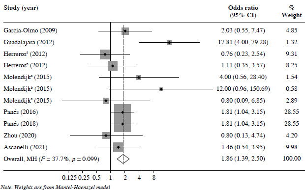 24 weeks’ follow-up: Eight articles reported on CR with a follow-up of 24 weeks. The results demonstrated that the treatment group benefited more from MSC treatment than the control group (odds ratio [OR] = 1.86, 95% CI: 1.39-2.50, p < 0.05) (Fig. 2).
