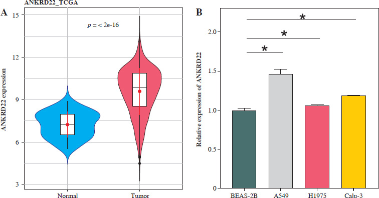 Elevated expression of ANKRD22 in lung adenocarcinoma (LUAD). A) Depiction of expression levels of ANKRD22 within LUAD tissues, as analyzed via the TCGA-LUAD database, with the blue color symbolizing normal tissue samples (n = 59) and red symbolizing tumor tissue samples (n = 539); B) qRT-PCR was used to measured the expression levels of ANKRD22 in human lung epithelial cells (BEAS-2B) and LUAD cell lines (A549, H1975, Calu-3). All experiments were conducted with 3 independent replicates. The data are presented as mean ± standard deviation. *p < 0.05