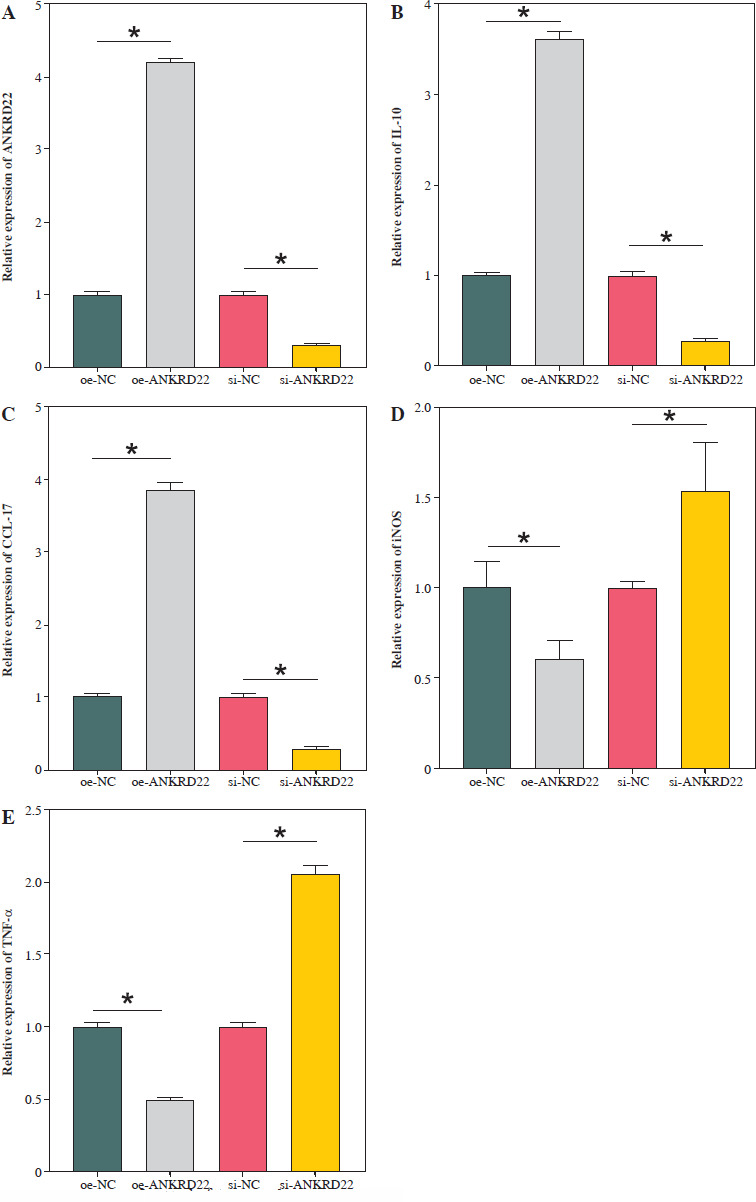 Elevated expression of ANKRD22 promotes M2 macrophage polarization. A) qRT-PCR was performed to detect transfection efficiency in oe-NC/oe-ANKRD22 and si-NC/si-ANKRD22. B-E) qRT-PCR was used to measure mRNA expression levels of M2 macrophage markers (IL-10, CCL-17) and M1 macrophage markers (iNOS, TNF-α) in A549 cells. The data are presented as mean ± standard deviation. *p < 0.05 F-H) Flow cytometry was used to detect the effects of ANKRD22 overexpression or knockdown on the proportions of CD68+CD86+ and CD68+CD206+ macrophages. All experiments were conducted with 3 independent replicates. The data are presented as mean ± standard deviation. *p < 0.05 I) Flow cytometry was used to detect the effects of ANKRD22 overexpression or knockdown on the proportions of CD68+CD86+ and CD68+CD206+ macrophages. J) WB was used to detect the effects of ANKRD22 overexpression or knockdown on the protein expression levels of CD80 and CD163. All experiments were conducted with 3 independent replicates. The data are presented as mean ± standard deviation. *p < 0.05