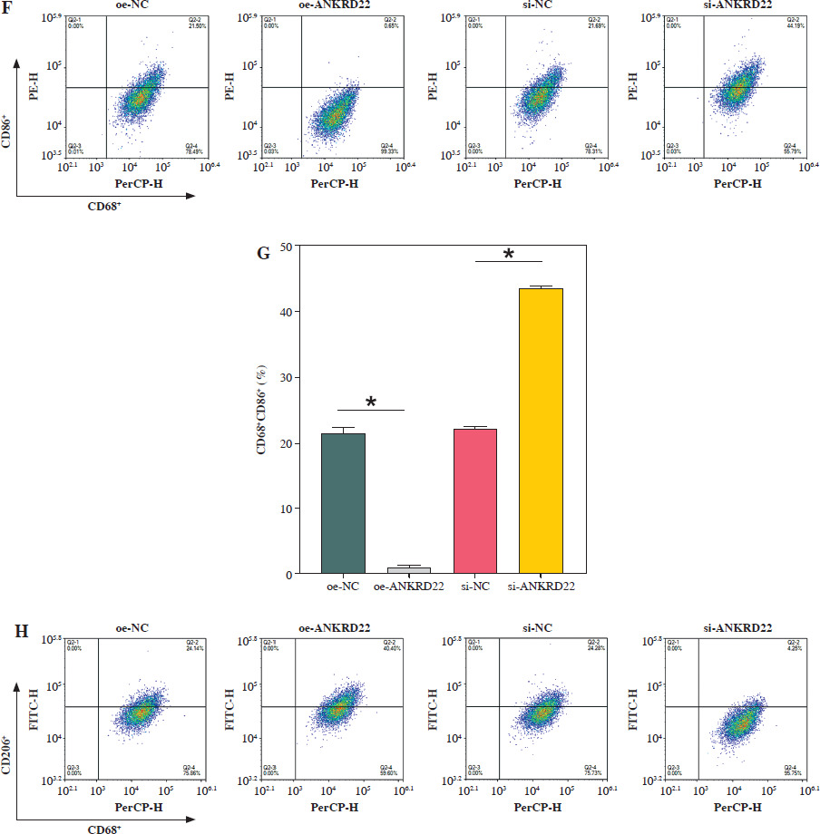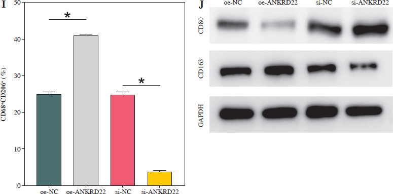 It has been documented that ANKRD22 participates in the regulation of TME in a multitude of cancers, potentially being associated with the polarization of TAMs. To ascertain the influence of ANKRD22 expression levels on macrophages within LUAD, we performed overexpression or knockdown of ANKRD22 in A549 cells, categorizing them into the following groups: oe-NC, oe-ANKRD22; si-NC, si-ANKRD22. The efficiency of transfection was evaluated by qRT-PCR (Fig. 2A). The supernatants from the culture medium of these categorized cells were harvested to cultivate THP-1 cells which had been stimulated with PMA. The expression levels of M1 and M2 macrophage markers were subsequently detected to delineate the effect of ANKRD22 on macrophage polarization. qRT-PCR results showed that overexpression of ANKRD22 significantly upregulated the mRNA relative expression levels of M2 macrophage markers IL-10 and CCL-17, while the opposite was observed upon ANKRD22 knockdown (Fig. 2B, C). When the oe-ANKRD22 group was compared to the oe-NC group, markedly lower mRNA expression levels of the M1 macrophage markers iNOS and tumor necrosis factor α (TNF-α) were observed. In contrast, the knockdown of ANKRD22 (si-ANKRD22 group) led to significantly higher levels of these markers compared to the si-NC group (Fig. 2D, E). These collective results suggested that the elevated expression of ANKRD22 could suppress the polarization of M1 macrophages and enhance the polarization of M2 macrophages. Subsequent flow cytometry to determine the proportions of M1 (CD68+CD86+) and M2 (CD68+CD206+) macrophages confirmed that the overexpression of ANKRD22 led to a pronounced reduction in the proportion of CD68+CD86+ macrophages (Fig. 2F, G) and a corresponding increase in the proportion of CD68+CD206+ macrophages (Fig. 2H, I), with inverse results observed upon the knockdown of ANKRD22. Furthermore, the expression of CD80, a protein marker for M1 macrophages, and CD163, a protein marker for M2 macrophages, was assessed via Western blot (WB). As depicted in Figure 2J, relative to the oe-NC group, the oe-ANKRD22 group displayed markedly lower in CD80 expression and markedly higher CD163 expression. The si-ANKRD22 group exhibited much higher CD80 and lower CD163 expression levels when compared to the si-NC group. In conclusion, the expression levels of ANKRD22 were capable of affecting macrophage polarization in LUAD, with increased expression favoring M2 polarization and decreased expression inhibiting it.