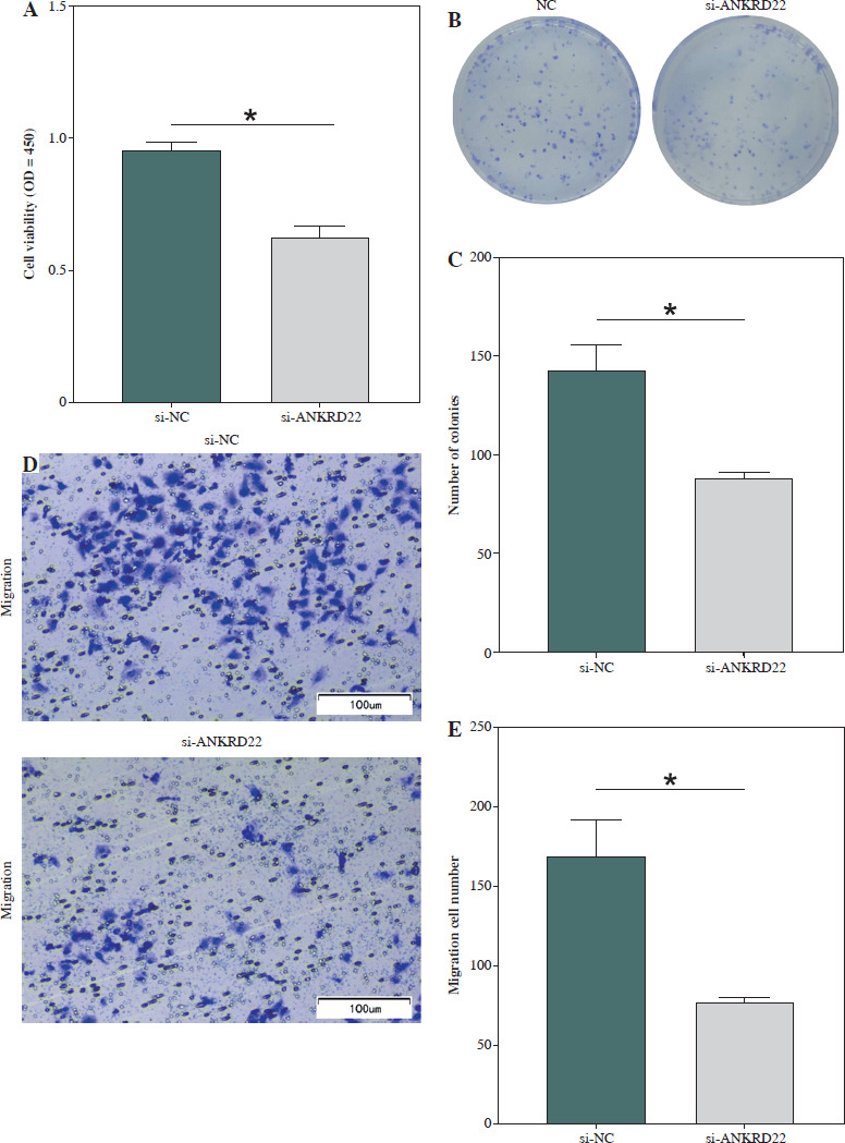 Reduced ANKRD22 expression suppresses malignant phenotypes in lung adenocarcinoma (LUAD). A) CCK-8 assay measured A549 cell viability. B, C) Colony formation assays assessed A549 cell proliferation. D, E) Transwell assays tested A549 cell migration. All experiments were conducted with 3 independent replicates. The data are presented as mean ± standard deviation. *p < 0.05