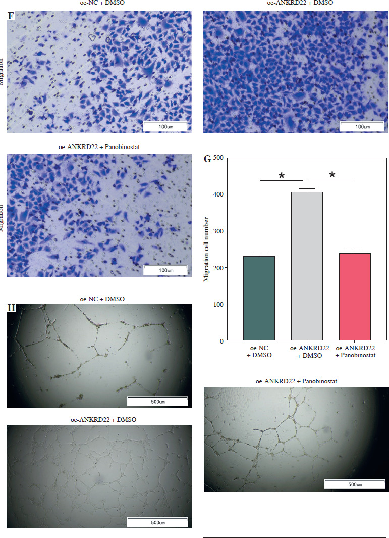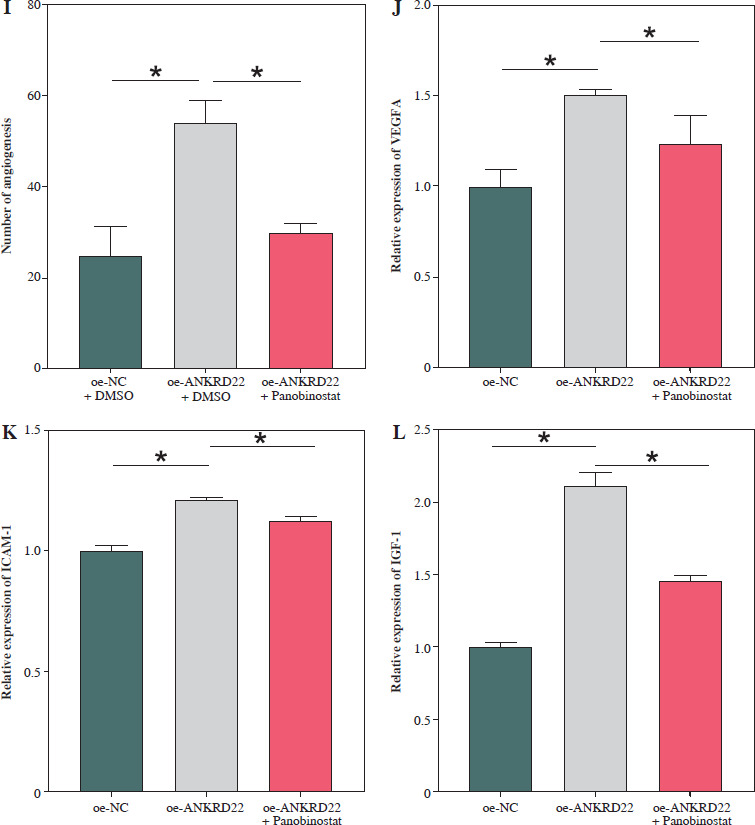 According to existing literature, macrophages within the TME are intimately associated with tumor progression, with M2 macrophages having the capacity to directly influence tumor cell survival, growth, and metastasis through the promotion of tumor angiogenesis. Given our findings, we hypothesized that alterations in the expression of the ANKRD22 gene in LUAD might impact the M2 polarization of macrophages, consequently affecting the angiogenesis within the TME. To test this hypothesis, we transfected A549 cells with the oe-ANKRD22 plasmid and introduced the macrophage M2 polarization inhibitor panobinostat to macrophages that had been educated by A549 cells to set up a rescue experiment, that is, to construct oe-NC+DMSO, oe-ANKRD22+DMSO, and oe-ANKRD22+panobinostat cell groups. qRT-PCR analyses on the three groups of macrophages showed that overexpression of ANKRD22 significantly increased mRNA levels of M2 macrophage markers IL-10 and CCL-17, which were reversed by panobinostat treatment (Fig. 4A, B). Flow cytometry was applied to detect the proportion of M2 macrophages, revealing that ANKRD22 overexpression in A549 cells enhanced M2 polarization, an effect reduced by an M2 polarization inhibitor (Fig. 4C, D). Western blot analyses on the three groups of macrophages confirmed that CD163 protein levels increased with ANKRD22 overexpression but were normalized by panobinostat (Fig. 4E). We cultured HUVEC cells with macrophage supernatants from the three groups to test the impact of M2 polarization on tumor migration and angiogenesis. Transwell assays were performed to gauge the migration ability of HUVEC cells in the three groups, showing that ANKRD22 over- expression boosted HUVEC migration, with M2 polarization further enhancing this effect (Fig. 4F, G). Angiogenesis assays revealed more vascular structures in the oe-ANKRD22 + DMSO group than in the oe-NC + DMSO group, while those in the oe-ANKRD22 + panobinostat group were markedly fewer than the oe-ANKRD22 + DMSO group (Fig. 4H, I). qRT-PCR of the mRNA expression of angiogenesis-related factors VEGFA, ICAM-1, and IGF-1 confirmed these trends (Fig. 4J-L). These results suggested that ANKRD22 may drive tumor angiogenesis in LUAD by promoting M2 macrophage polarization.