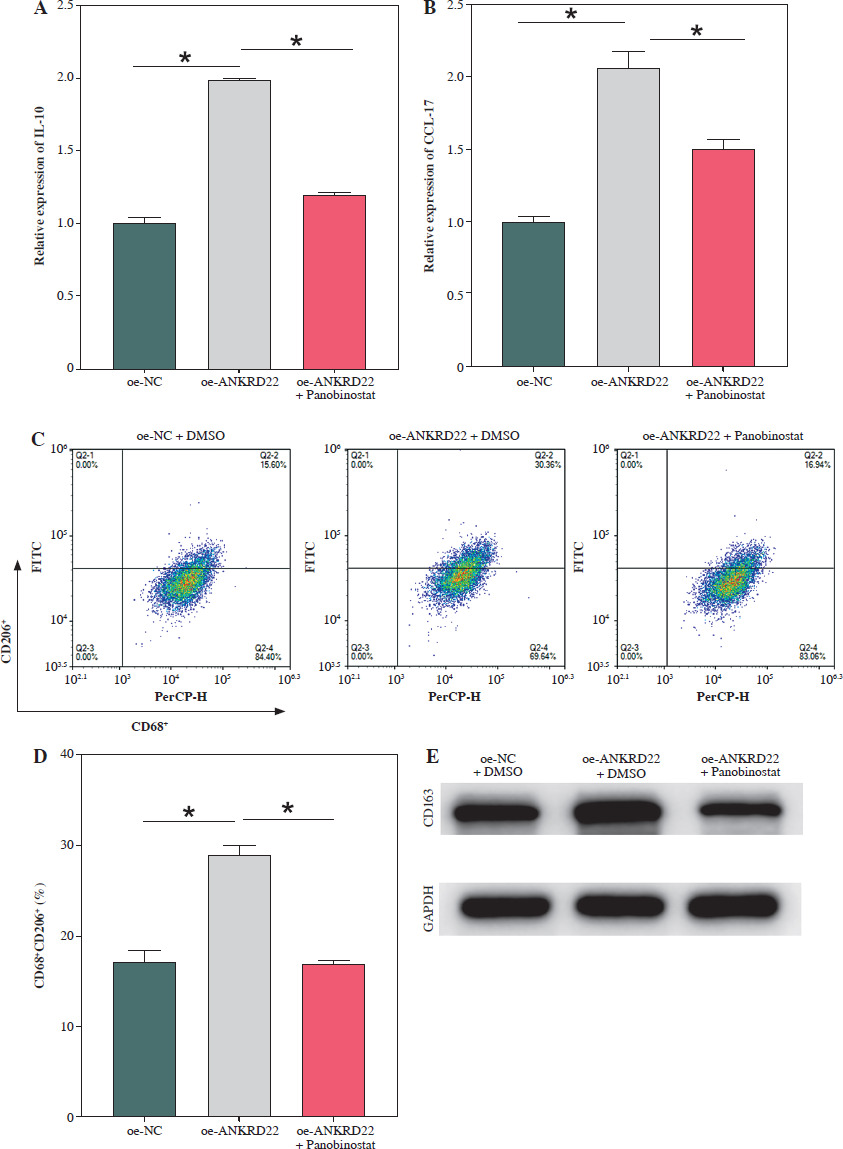 Elevated expression of ANKRD22 promotes M2 macrophage polarization. A) qRT-PCR was performed to detect transfection efficiency in oe-NC/oe-ANKRD22 and si-NC/si-ANKRD22. B-E) qRT-PCR was used to measure mRNA expression levels of M2 macrophage markers (IL-10, CCL-17) and M1 macrophage markers (iNOS, TNF-α) in A549 cells. The data are presented as mean ± standard deviation. *p < 0.05 F-H) Flow cytometry was used to detect the effects of ANKRD22 overexpression or knockdown on the proportions of CD68+CD86+ and CD68+CD206+ macrophages. All experiments were conducted with 3 independent replicates. The data are presented as mean ± standard deviation. *p < 0.05 I) Flow cytometry was used to detect the effects of ANKRD22 overexpression or knockdown on the proportions of CD68+CD86+ and CD68+CD206+ macrophages. J) WB was used to detect the effects of ANKRD22 overexpression or knockdown on the protein expression levels of CD80 and CD163. All experiments were conducted with 3 independent replicates. The data are presented as mean ± standard deviation. *p < 0.05