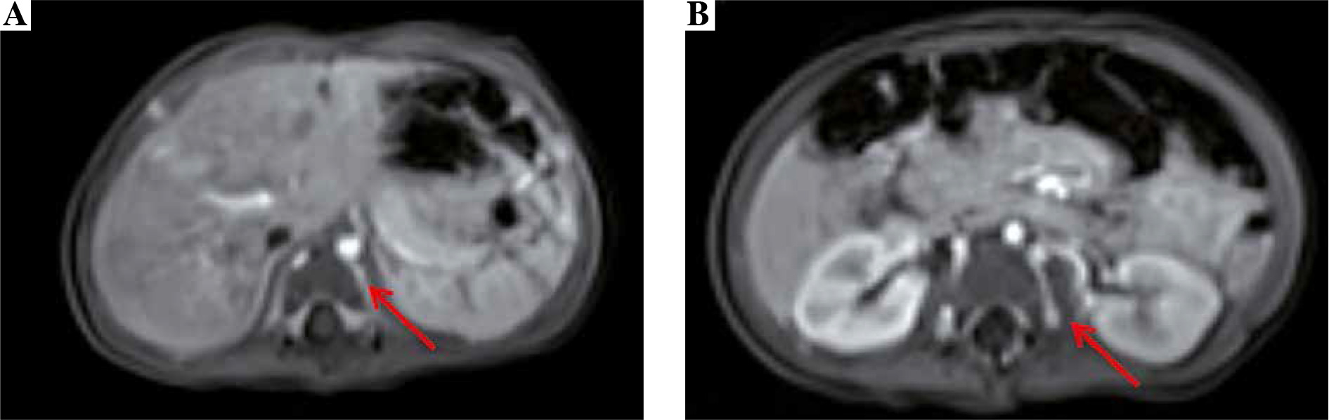 We present a case of a female infant born from second pregnancy (first pregnancy resulted in miscarriage in 20th week of gestation after abdominal injury), mother of Latin American descent, father of Polish origin. Negative family history of kidney diseases, calcium and phosphate homeostasis disorders, urolithiasis, systemic diseases, and thrombosis. The pregnancy was complicated by hypothyroidism, uterine myoma, urinary tract infections, and appendectomy at 16th week of gestation. Fetal ultrasound scan (US) performed repeatedly did not show any abnormalities, with normal image of the kidneys. The baby was born by caesarean section due to pre-labor rupture of the membranes, with a body weight of 3,570 γ and Apgar score of 10. The adaptation period was normal; the girl was vaccinated according to routine vaccination schedule and breastfed. At the age of 2 months, she was hospitalized in the city hospital due to bronchiolitis. The abdominal US showed kidneys 45 mm long with an abnormal image of the renal columns, with numerous hyperechogenic foci. Nephrocalcinosis was suspected and the infant was referred to our hospital. The girl was admitted at the age of 3 months in good general condition, no physical abnormalities, and arterial blood pressure of 77/36 mm Hg. Laboratory examination were as follows (reference ranges in brackets): WBC 8.06 × 103/µl (5.7-17), RBC 4.09 × 106/µl (3.2-4.3), PLT 415 × 103/µl (250-550), CRP < 0.5 mg/dl (≤ 1.0), creatinine 0.2 mg/dl (0.2-0.4), urea 14.0 mg/dl (2.2-27.8), calcium 10.5 mg/dl (7.7-11.5), phosphorus 7.2 mg/dl (2.5-7.0), alkaline phosphatase 281 U/l (80-345), 25(OH)D 20.4 ng/ml (20-50), parathyroid hormone 7.7 pg/ml (12-95); urinary crystallization ratio: calcium : creatinine ratio 0.43 (< 0.81), phosphorus : creatinine ratio 0.85 (0.3-1.2), magnesium : creatinine ratio 0.55 (> 0.1), magnesium : calcium ratio 1.29 (0.8-1.3). The results of urinalysis were within the normal range. In the ultrasound scan, numerous hyperechogenic foci in both kidneys were observed and nephrocalcinosis was suspected. Vitamin D3 supplementation was discontinued. After 3 months, serum phosphorus normalized (6.0 mg/dl), and 25(OH)D level was slightly below normal range (19.8 ng/ml). US showed right kidney 54 mm long, left kidney 62 mm long, linear calcifications along the pyramids visible in both kidneys, more lesions in the left kidney (Figs. 1A, 1B, 1D). Doppler scan showed lack of visible blood flow from the renal veins to IVC, with compensatory flow from the renal veins to the paravertebral plexuses; IVC obliteration, with a massive calcification in the hepatic section (Fig. 1C); minor linear calcifications in the liver caudate lobe at the point of contact with IVC. The connection between IVC and common iliac veins were not visible. The image suggested the history of extensive venous thrombosis. Magnetic resonance (MR) revealed no contrast flow in the iliac veins and IVC, compensatory venous outflow from the lower limbs and from the kidneys to the paravertebral plexuses (Fig. 2); in IVC, a segmental dilatation of 11 × 7 mm over a length of 23 mm spatially coincident with calcification described in the ultrasound scan. The results of coagulation system were as follows: INR 1.01 (0.9-1.2), kaolin-cephalin clotting time 34.62 s (28-40), fibrinogen 1.77 g/l (1.80-3.50), homocysteine 6.92 µmol/l (3.70-13.90), antithrombin III 96.3% (75-125), protein C 61% (50-125), protein S 67.36% (50-125), D-dimers 6893.06 µg/l (0-550). Leiden factor V mutation and c.20210G > A prothrombin gene mutation were excluded. Due to the increased concentration of D-dimers and obliterated IVC, low-molecular-weight heparin was administered at the therapeutic dose (nadroparin, 100 IU antiXa/kg once daily, subcutaneously). Anticoagulation was continued for 4 months. After a month of anticoagulation, D-dimer levels came back to normal (433.54 µg/l). Ultrasound scan performed at the age of 10 months showed: right kidney 60 mm long, left kidney 68 mm long, image of the venous system as in the previous study. The girl is currently 2 years old, develops according to age, and is under the care of a nephrology and hematology clinic. Obliterated venous vessels did not recanalize.