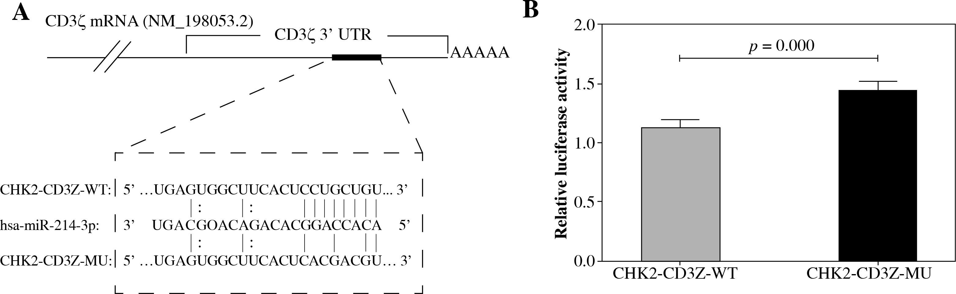 Validation of miR-214 targeting the CD3ζ 3’-UTR by luciferase assay. A) The predicted binding site for miR-214 in the CD3ζ 3’-UTR. The red letters indicate mutation sites in the CD3ζ 3’-UTR. B) The miR-214 mimic (100 nM) or negative control were transfected with CHK2-CD3Z-WT or CHK2-CD3Z-MU reporter plasmids into HEK293T cells. After 48-h co-transfection, the luciferase activity was measured with the Dual-Glo Luciferase Assay System. The relative luciferase activity was significantly decreased in the CHK2-CD3Z-WT group