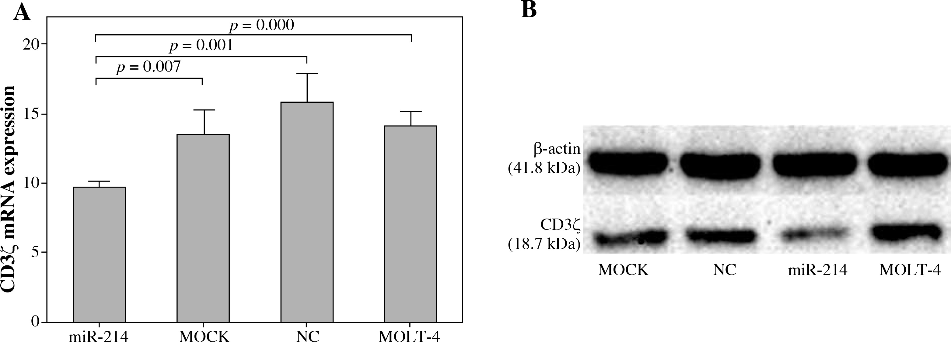 We further investigated whether miR-214 could regulate CD3ζ expression in T cells by transfecting a miR-214 mimic into MOLT-4 cells. The effects of miR-214 on CD3ζ mRNA and protein expression were assessed using qRT-PCR and Western blotting. As shown in Figure 2, the CD3ζ mRNA expression level in the miR-214-mimic transfected cell group (9.76 ±0.45) was significantly lower than that in the MOLT-4, MOCK, and negative control groups (14.24 ±1.00, 13.56 ±1.81, and 15.98 ±2.04, respectively). Accordingly, Western blotting revealed that miR-214 reduces the CD3ζ protein level. These results were in accordance with the dual luciferase reporter assay findings and confirmed that miR-214 regulates CD3ζ.