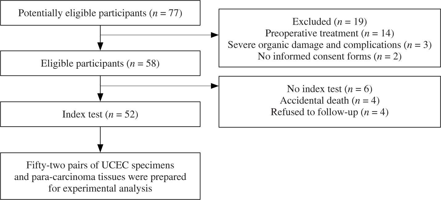 In the current cohort, a total of 52 pairs of UCEC and para-carcinoma tissues were collected from the First Affiliated Hospital of Ningbo University. The patient flow diagram is presented in Figure 1. After collection, the clinical specimens were immediately stored in liquid nitrogen. This study was approved by the Ethics Committee of the First Affiliated Hospital of Ningbo University (approval no. 2020C01009) on January 1, 2020. Furthermore, all patients signed informed consent forms.