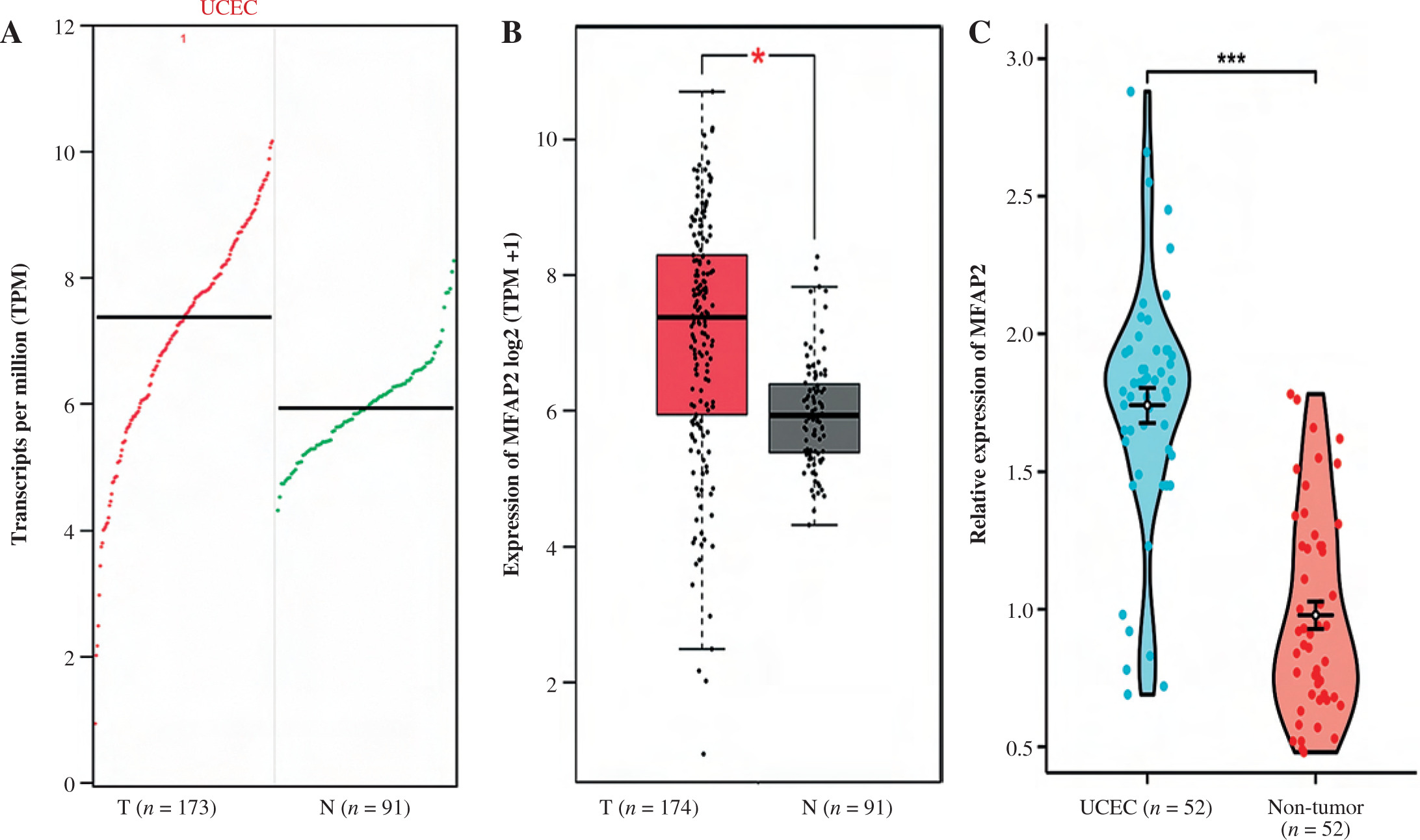 MFAP2 mRNA expression is elevated in UCEC tissues. Based on TCGA database online bioinformatics software GEPIA (http://gepia.cancer-pku.cn/) was used to analyze MFAP2 transcripts (A) and mRNA expression (B) in UCEC specimens and normal tissues. A total of 52 pairs of UCEC specimens and para-carcinoma tissues were collected to detect MFAP2 mRNA expression using RT-qPCR (C). *p < 0.05, ***p < 0.001