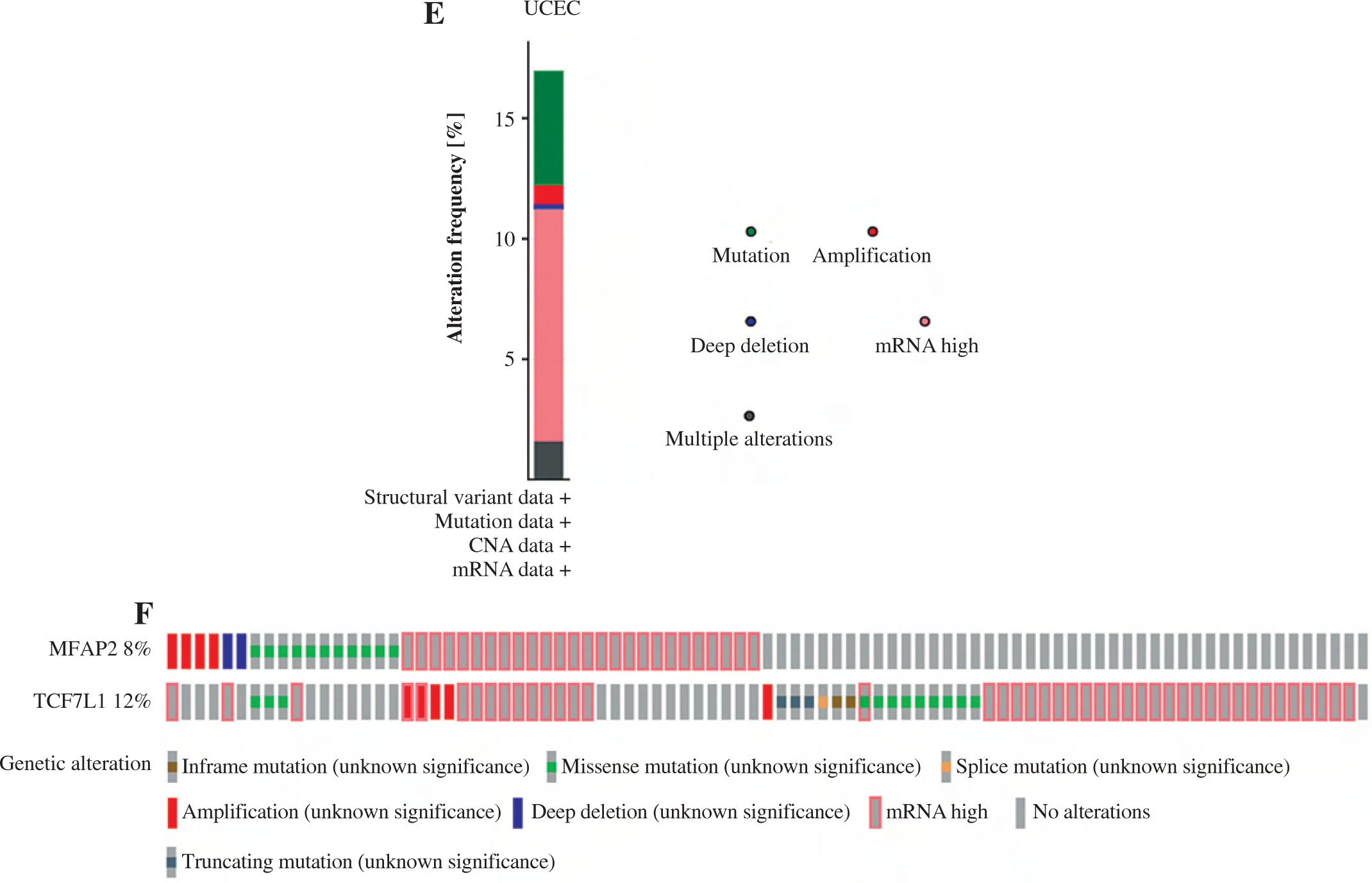 The underlying molecular mechanisms of TCF7L1 in the pathogenesis of UCEC were predicted using KEGG (https://www.genome.jp/kegg) analysis. The analysis demonstrated that the TCF/LEF family members could be involved in UCEC cell proliferation via c-Myc and cyclin D1 (CCND1). Based on the TCGA 587 RNAseq dataset, a significant positive association (r = 0.620, p < 0.001) between MFAP2 and TCF7L1 was obtained in UCEC (n = 552) and normal tissues (n = 35; Fig. 4A). In both the TCGA database (Fig. 4B) and the study population (Fig. 4C), the mRNA expression levels of TCF7L1 were significantly higher in UCEC tissues compared with the corresponding normal tissues. As shown in Fig. 4D, TCF7L1 mRNA expression was positively associated with MFAP2 expression (r = 0.647, p < 0.001) in patients with UCEC. In addition, the alterations in MFAP2 and TCF7L1 genes were analyzed using the cBioPortal online tool (http://www.cbioportal.org/). As shown in Figure 4E and F, MFAP2 and TCF7L1 genes were altered in 43/507 (8%) and 63/507 (12%) UCEC samples, respectively. Intriguingly, the alterations of mRNA expression were the most prominent finding in patients with UCEC (Fig. 4E, F).