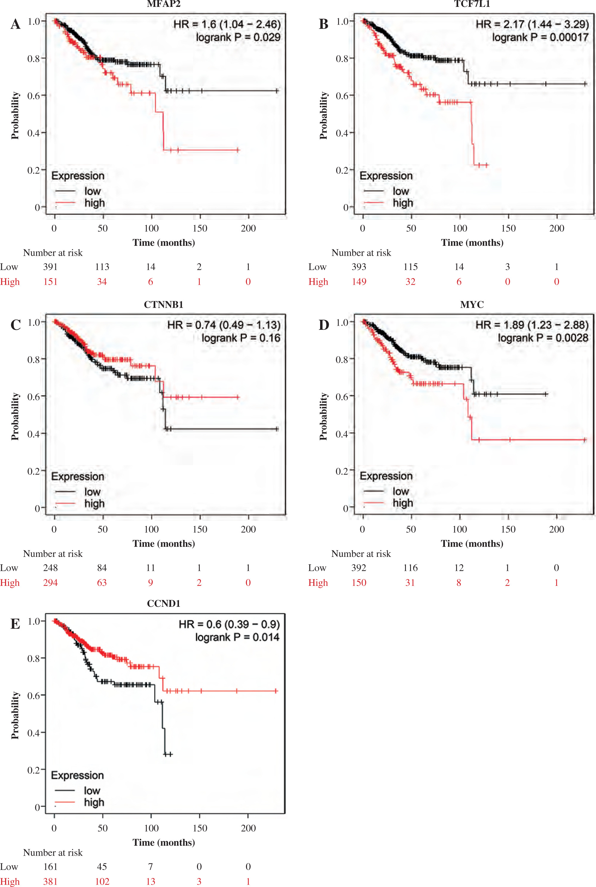 High MFAP2 and TCF7L1 expression predicts poor overall survival in UCEC patients. The association between prognosis and MFAP2 (A), TCF7L1 (B), CTNNB1 (C), MYC (D) or CCND1 (E) expression in UCEC patients was analyzed using the Kaplan-Meier Plotter online tool (http://kmplot.com/analysis/index.php?p=background)