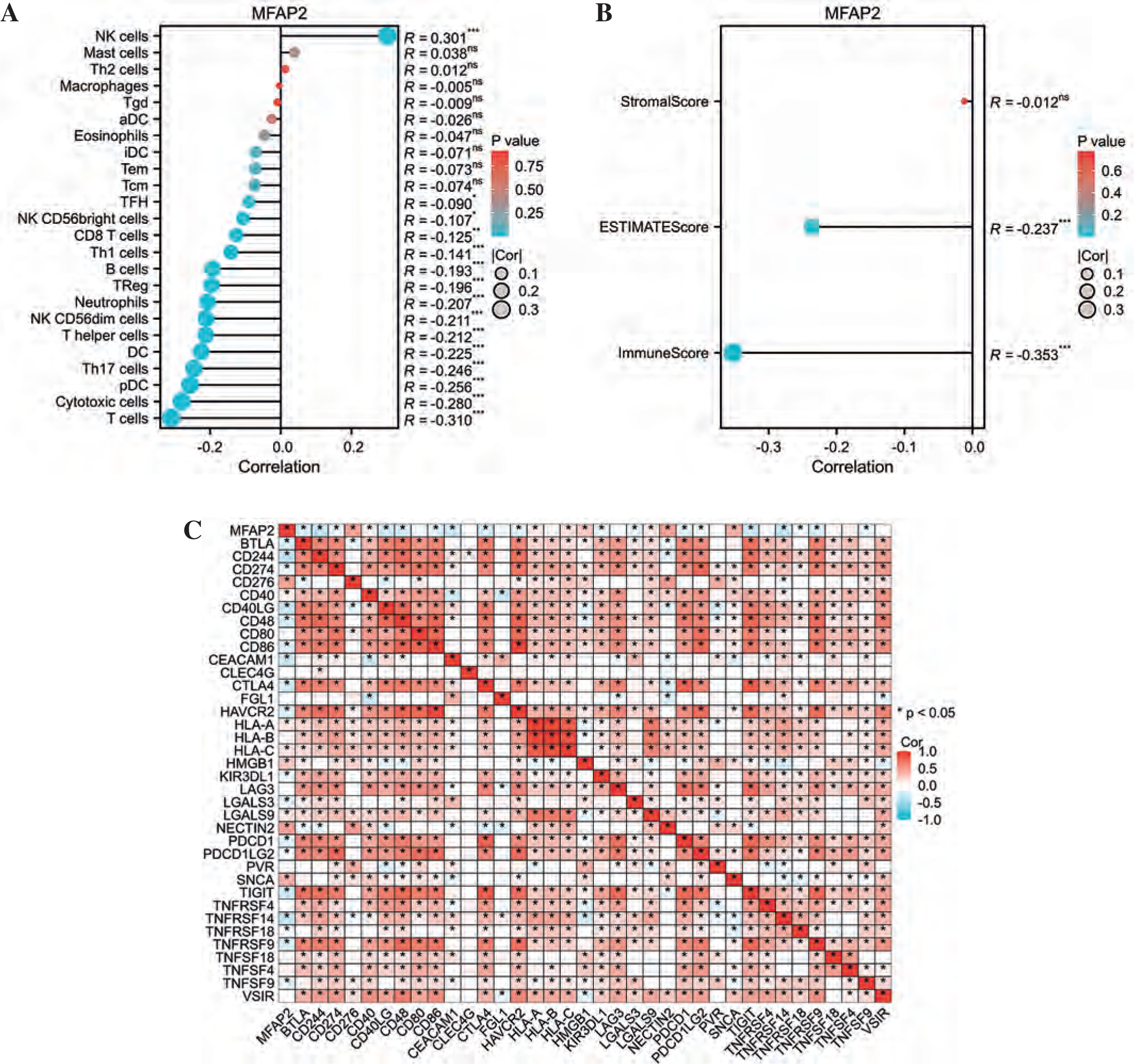 The association of MFAP2 with immune infiltration in UCEC. Utilizing the ssGSEA algorithm (A), and the ESTIMATE algorithm (B) to investigate the association of MFAP2 with immune infiltration in UCEC patients using the TCGA database. The relationship between MFAP2 and 36 prevalent ICMs in UCEC is currently under investigation to validate the association between MFAP2 and immune cell enrichment (C)