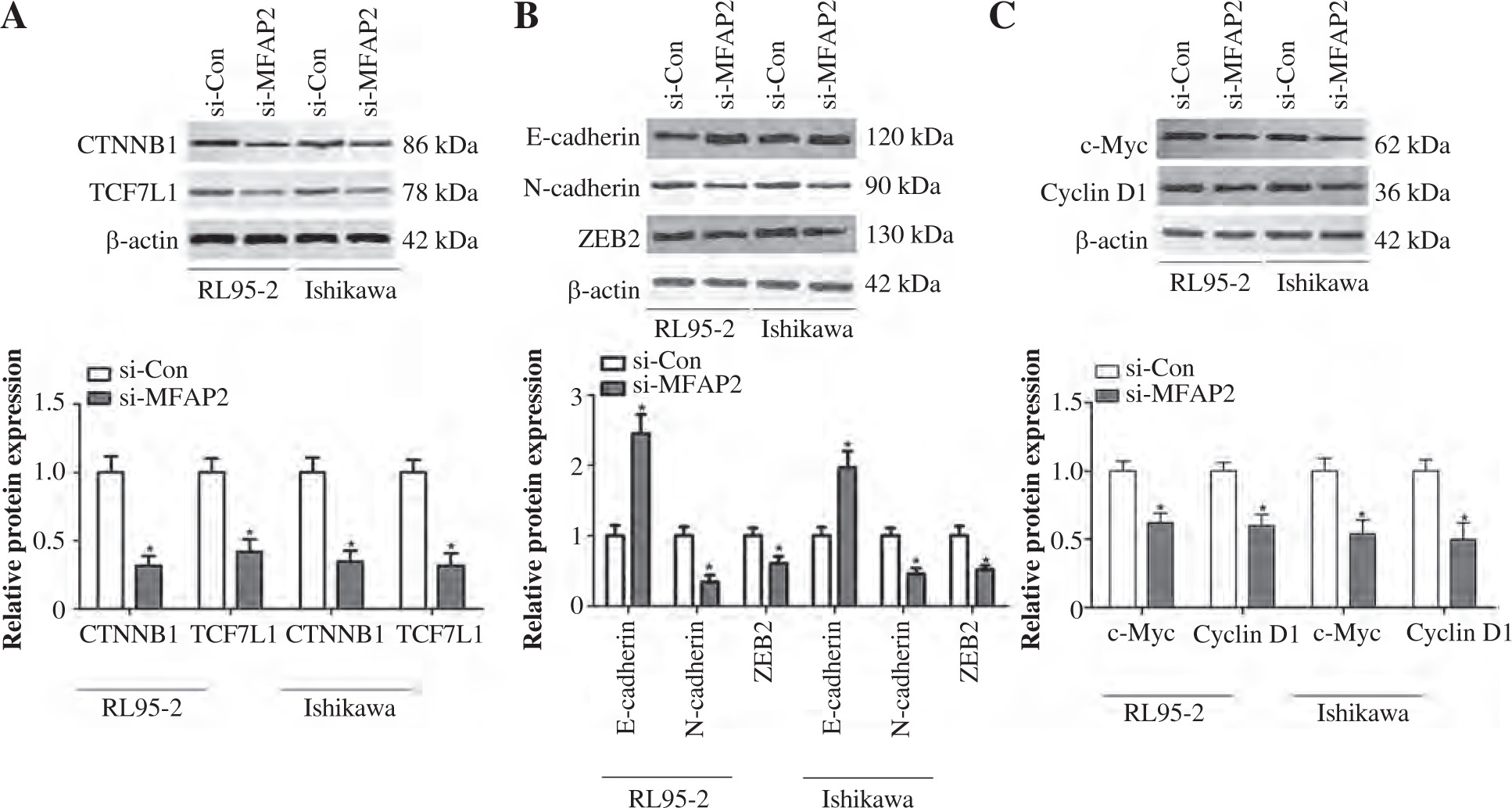 MFAP2 knockdown represses TCF7L1 and its downstream targets. A) After si-MFAP2 or si-Con transfection, β-catenin and TCF7L1 protein levels were measured in UCEC RL95-2 and Ishikawa cell lines using western blot. B) EMT markers, E-cadherin, N-cadherin, and ZEB2 protein levels were measured in UCEC RL95-2 and Ishikawa cell lines using western blot. C) c-Myc and CyclinD1 protein levels were measured in UCEC RL95-2 and Ishikawa cell lines using western blot. *p < 0.05 compared with si-Con group. n = 3 in each group