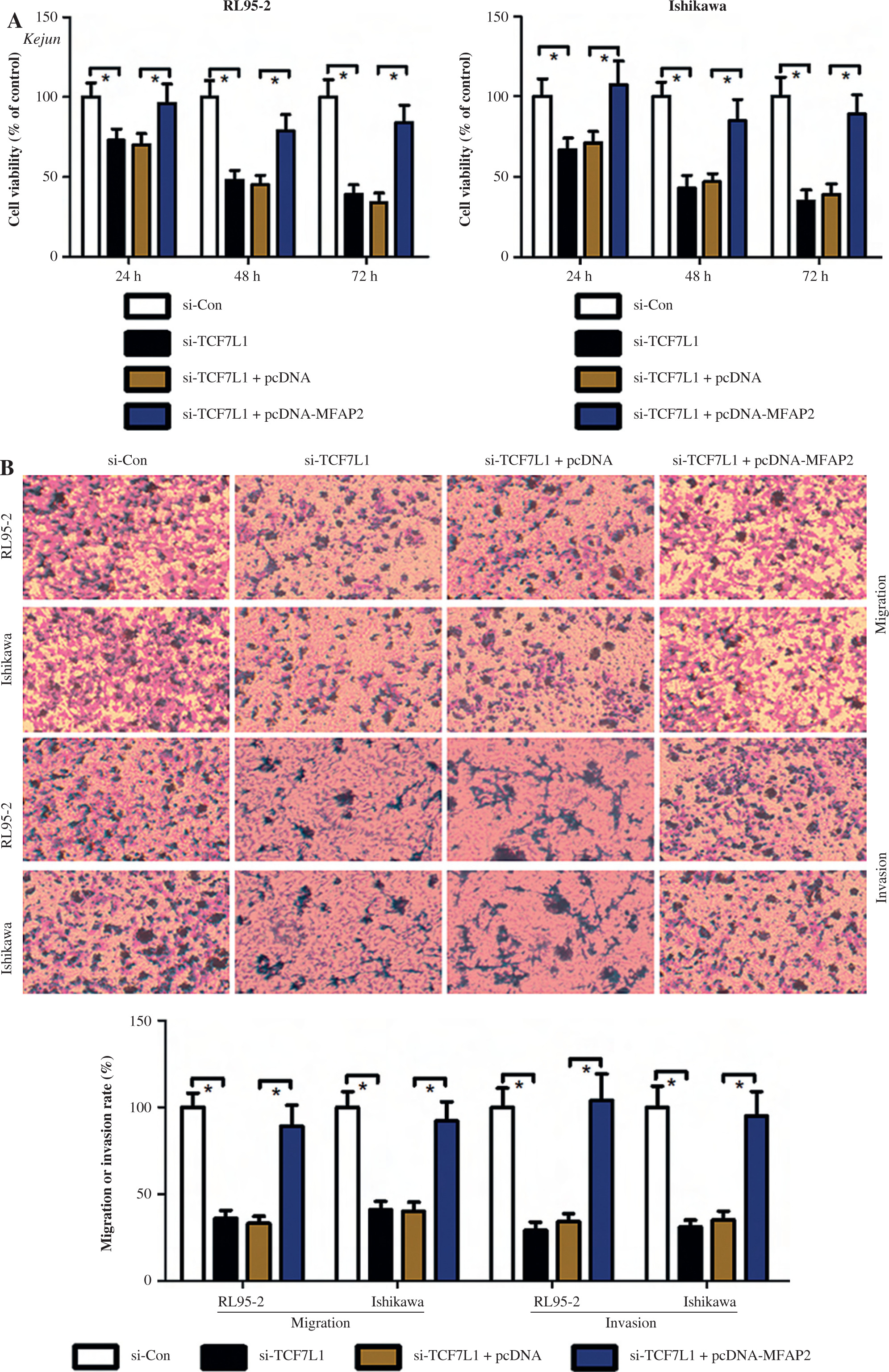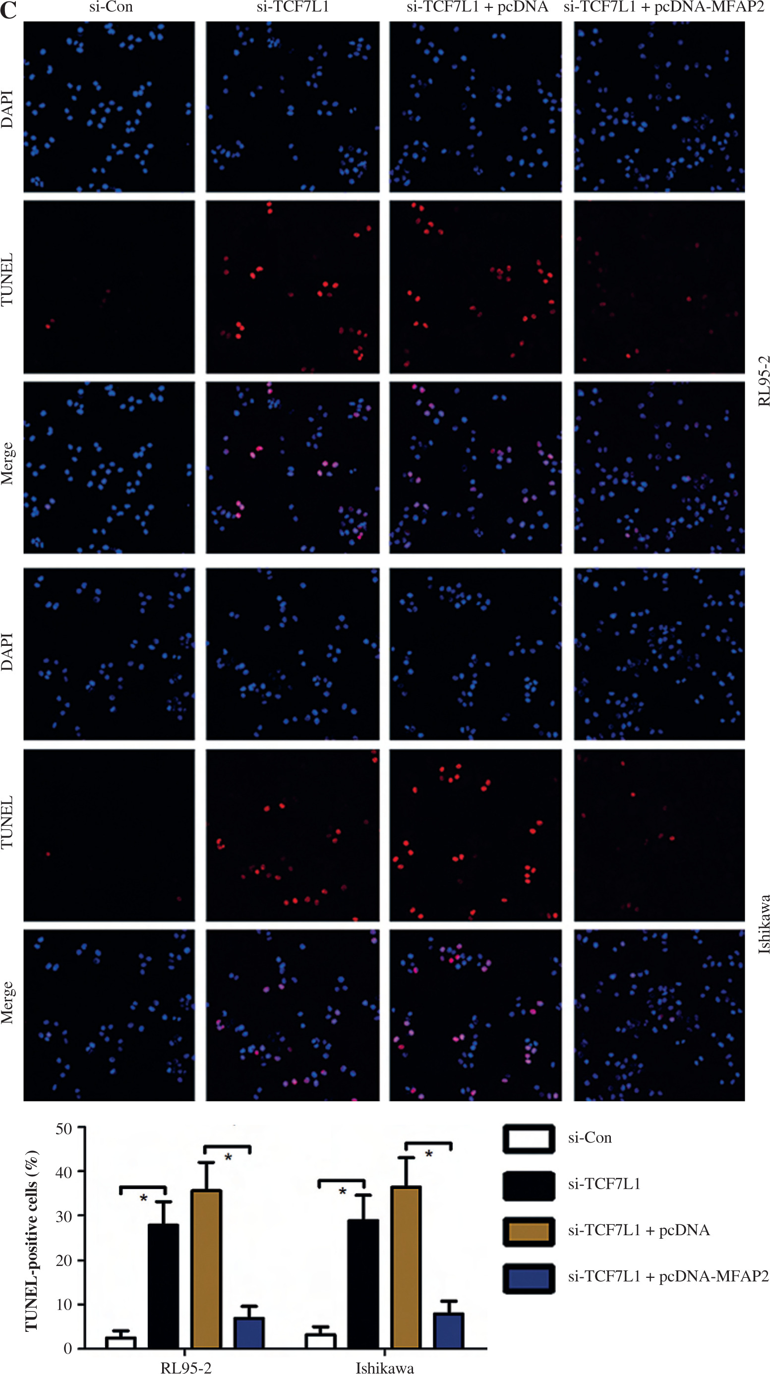 TCF7L1 knockdown inhibits proliferation, migration, and invasion and promotes apoptosis in RL95-2 and Ishikawa cells. After co-transfection with si-TCF7L1 and MFAP2 overexpression plasmids, cell proliferation, migration and invasion, and apoptosis were evaluated using CCK-8 (A), Transwell (B); *p < 0.05, n = 3 in each group After co-transfection with si-TCF7L1 and MFAP2 overexpression plasmids, cell proliferation, migration and invasion, and apoptosis were evaluated using TUNEL (C) assay; *p < 0.05, n = 3 in each group