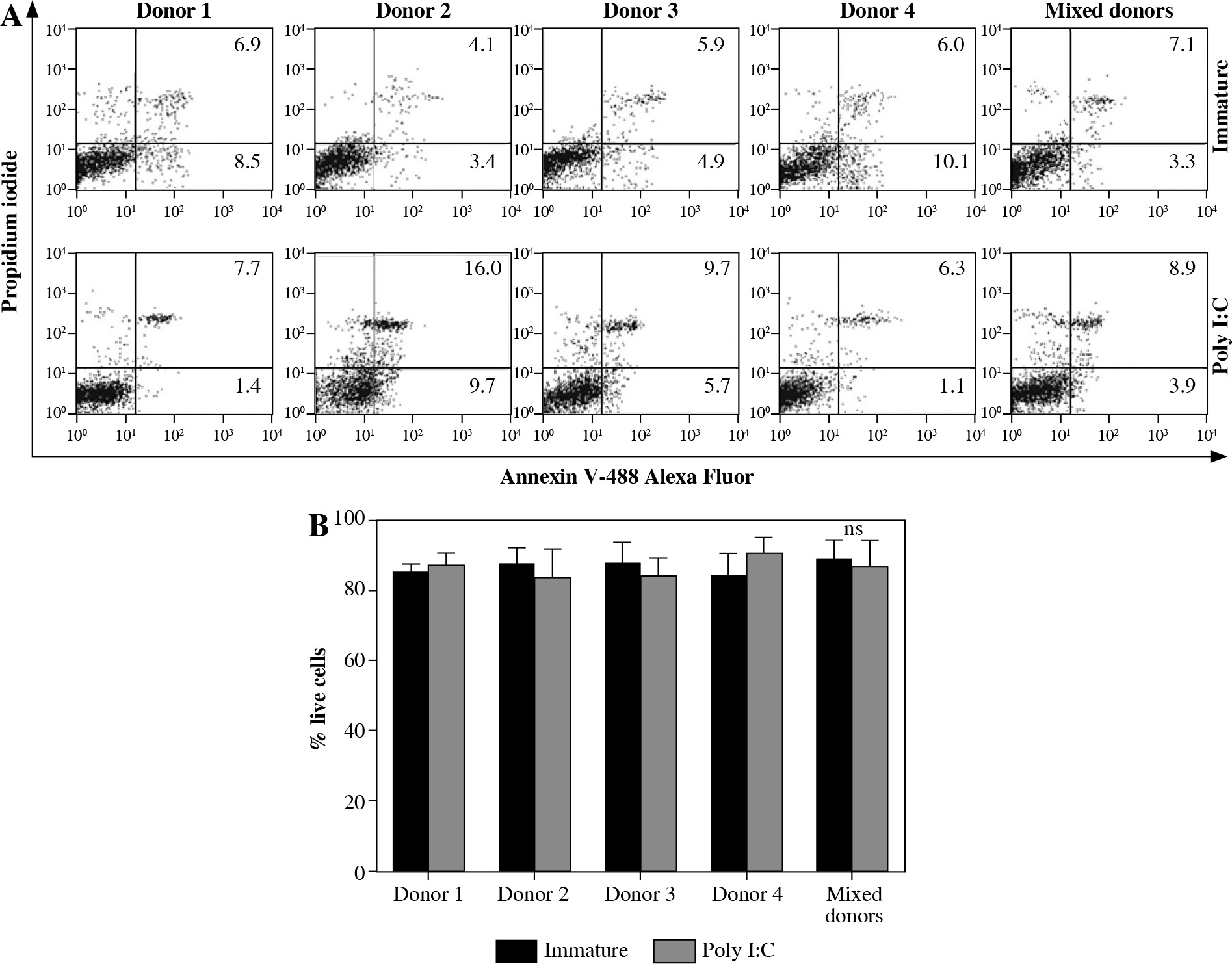 Cultures of mixed allogeneic DCs are stable for longer periods in terms of cell survival. Dendritic cells wereprepared and cultured as described in Material and methods. Differentiated from monocytes isolated from four unrelatedhealthy donors, the resulting iDCs were cultured both individually and in a co-culture, for 72 hours. Either single ormixed donor DCs were maintained in their immature state or matured with the addition of poly I:C (20 μg/ml). A) After3 days the cells were stained with Annexin-FITC and PI to determine the percentages of apoptotic and dead cells. Numbersrepresent the percentages of single positive (apoptotic, lower right quadrant) and double positive (dead, upper rightquadrant) cells. B) Percentages of living DCs in various cultures do not differ between mixed and single donor cultures.Significance between individual pairs was calculated using Student’s unpaired t test (ns – non-significant). The resultsshown in flow cytometry charts are representatives of 3 independent experiments