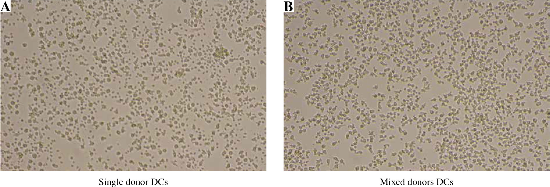 In vitro morphology of monocyte-derived DCs depends on their maturation status, in addition to the quality of differentiation process, as well as subtle differences such as characteristic clustering upon activation with concomitant cell adhesion or formation of spindle-shape morphology, which are the consequence of different cell culture conditions. For this reason, we wanted to compare the basic DC morphology between single donor and mixed donor cultures. Using an inverted optical microscope we observed DC morphology after 48 hours of various cell culture conditions, without additional activation stimuli, such as the addition of poly I:C or lipopolysaccharide (LPS) (except for the supplement of GM-CSF only). As can be seen in Figure 2, cell morphology in mixed allogeneic DC cultures displayed typical “potato”-shaped iDC morphology, with no excessive dendrite formation or cell clustering.