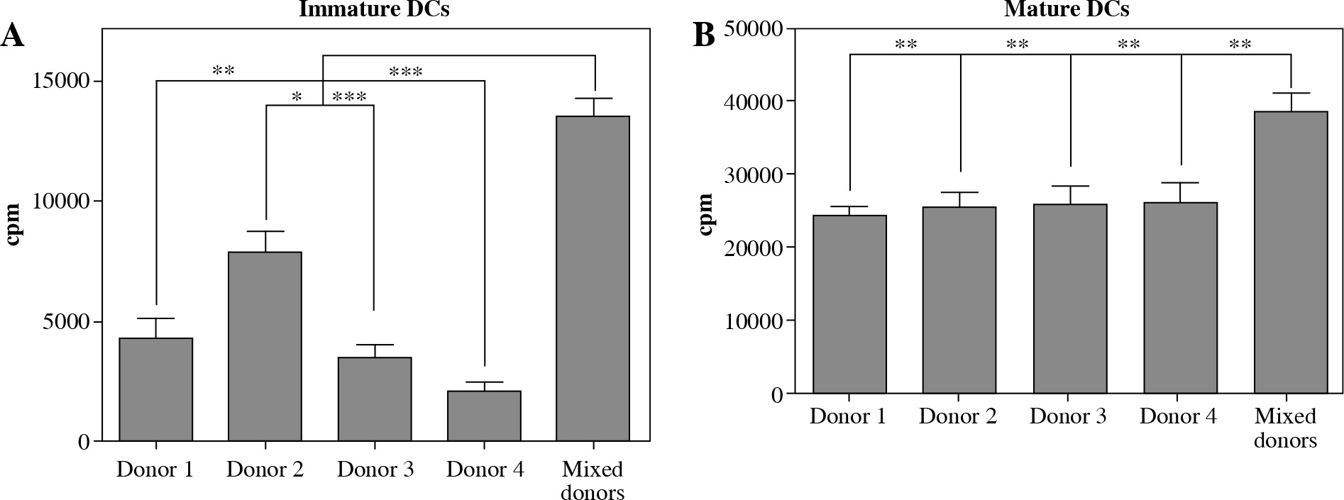 Dendritic cells (DCs) from mixed allogeneic donor cultures possess potent allo-stimulatory capacity. The capacity of DCs to stimulate proliferation of nal¨ve allogeneic CD4+ T cells was evaluated in a mixed lymphocyte culture (MLC). DCs were generated as described in Material and methods. DCs from single and mixed allogeneic donor cultures were used as stimulators either in their (A) immature or (B) mature (48 hour activation with 20 μg/ml poly I:C) state. Significance between compared pairs, as depicted in the figure, was calculated using Student’s unpaired t test (*p < 0.05, **p < 0.01, ***p < 0.001). The results are presented as mean ± SD