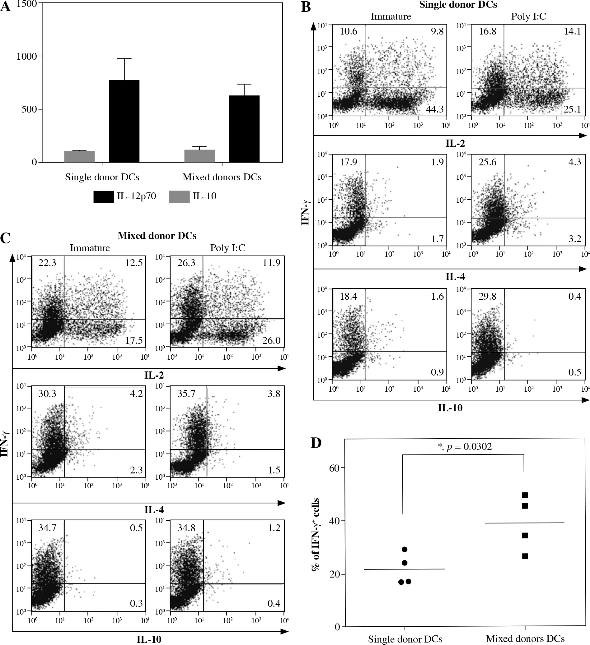Dendritic cells (DCs) from combined allogeneic donors induce potent Th1 effector responses. DCs were prepared as described in Material and methods and further cultured in either single or mixed donor cultures. A) After 48 hours, supernatants from both immature and mature (activated with 20 μg/ml poly I:C) DCs were taken and analyzed for the presence of IL-12p70 and IL10. B, C) Both immature and mature DCs were used as stimulators in 7 day MLCs with nal¨ve CD4+CD45RA+ T cells as responders. After one week T cells were harvested, treated with PMA/ionomycin/ Brefeldin A and stained intracellularly for IFN-γ, IL-2, IL-4 and IL-10. The results were analyzed on a flow cytometer. One representative experiment out of four individual ones is shown. Numbers in quadrants represent percentages of cells stained for each particular cytokine. D) Statistical significance for percentage of IFN-γ-positive T cells is shown. The results where single or mixed allogeneic donor mDCs (20 μg/ml poly I:C) were used as stimulators are presented. Statistical significance was calculated using Student’s unpaired t-test (*p < 0.05)
