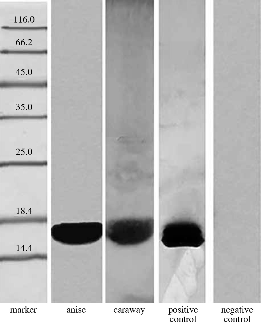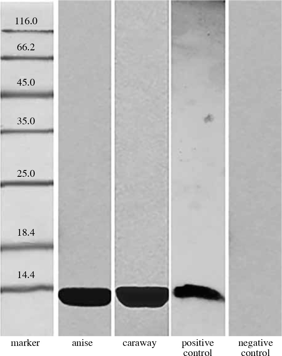 The presence of the Bet v 1 protein in anise, which was detected in this study, is consistent with the report of Jensen-Jarolim et al. [6], who found a 17 kDa homologue of Bet v 1 in this spice as well as in cumin, fennel, and coriander; the allergens were termed as “Pim a 1”, “Cum c 1”, “Foe v 1”, and “Cor s 1”, respectively [4]. No literature data concerning the presence of Bet v 1 homologues in caraway was found.