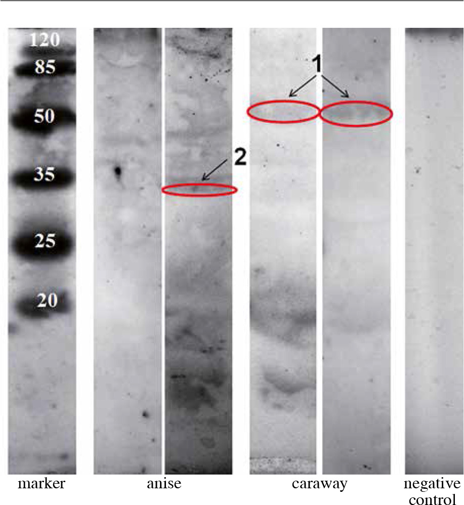 The allergenic properties of anise were confirmed by another study Garcia-González et al. [9], reporting a case of woman with occupational allergy to anise. In a prick skin tests, the woman exhibited immediate reactivity to caraway, anise, coriander, fennel, and dill. Immunoblotting showed that the patient’s IgE bound to anise proteins with a molecular mass of 48, 42, 39, 37, 34, 33, and 20 kDa, and caraway proteins with a molecular mass of 54, 42, 38, 31, and 20 kDa. Our blots revealed the following protein bands similar to those above-mentioned: 49.7, 49.5, 42.5, 39.3, 35.9, 34.2 kDa (anise), and 55.7 kDa (caraway).