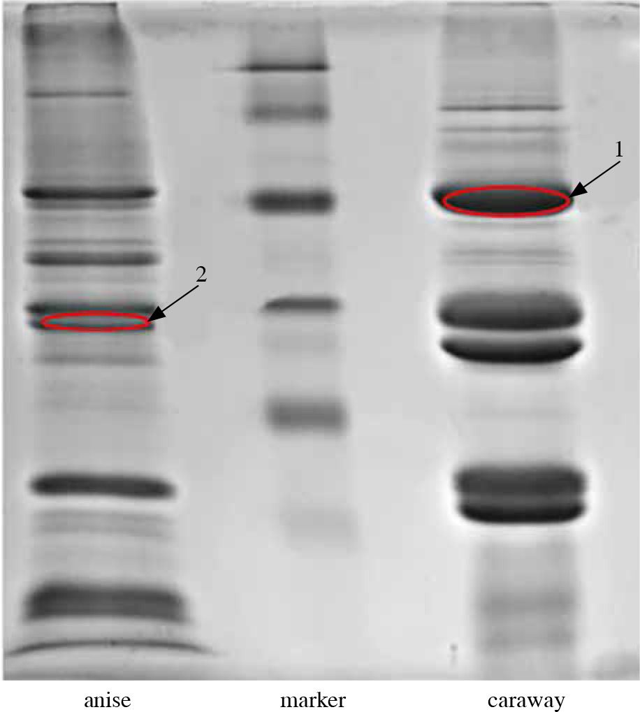 In order to determine the amino acid sequence of allergenic proteins, LC-MS/MS analysis was performed for two immunoblot bands (marked in red in Figure 3 and 4) with a mass of 56-55.7 kDa for caraway (band “1”) that was bound by IgE from two patients and present in both immunoblots, and 34.2 kDa for anise (band “2”), which was strongly bound by IgE from one patient, present in only one immunoblot.