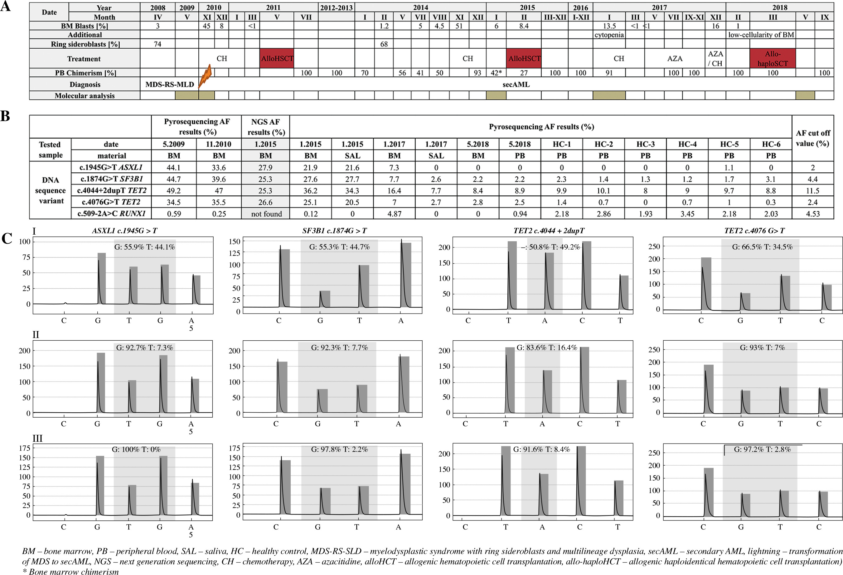A) Data concerning percentage content of bone marrow blasts, ring sideroblasts, peripheral blood chimerism, implemented treatment, performed molecular analysis and additional information during the course of the patient’s disease. B) Allele frequency results for selected DNA sequence variants (obtained by NGS and pyrosequencing) in BM, PB and SAL as well as information about AF for healthy control and AF cut-off value for selected DNA sequence variants. C) Electrophero- grams presenting results of pyrosequencing (c.1945G>T ASXL1; c.1874G>T SF3B1; c.4044+2dupT TET2; c.4076G>T TET2) performed in: I – May 2009, II – January 2017, III – May 2018
