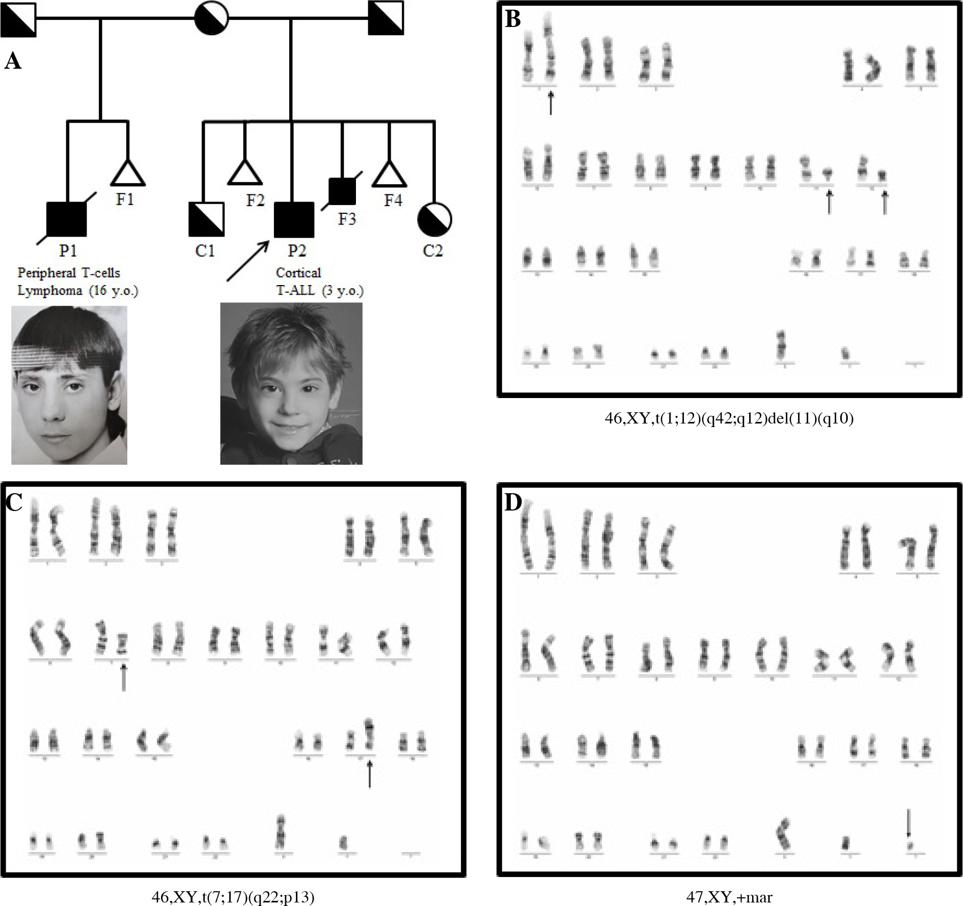 P2 developed cortical T-ALL at the age of 3 years and received reduced doses of chemotherapy. During treatment, toxic hepatitis, steroid myopathy and amylase increasing were observed. He achieved a complete remission and was treated with hematopoietic stem cell transplant (HSCT) at the age of 4 years. After 350 postransplant days, severe complications were not observed.