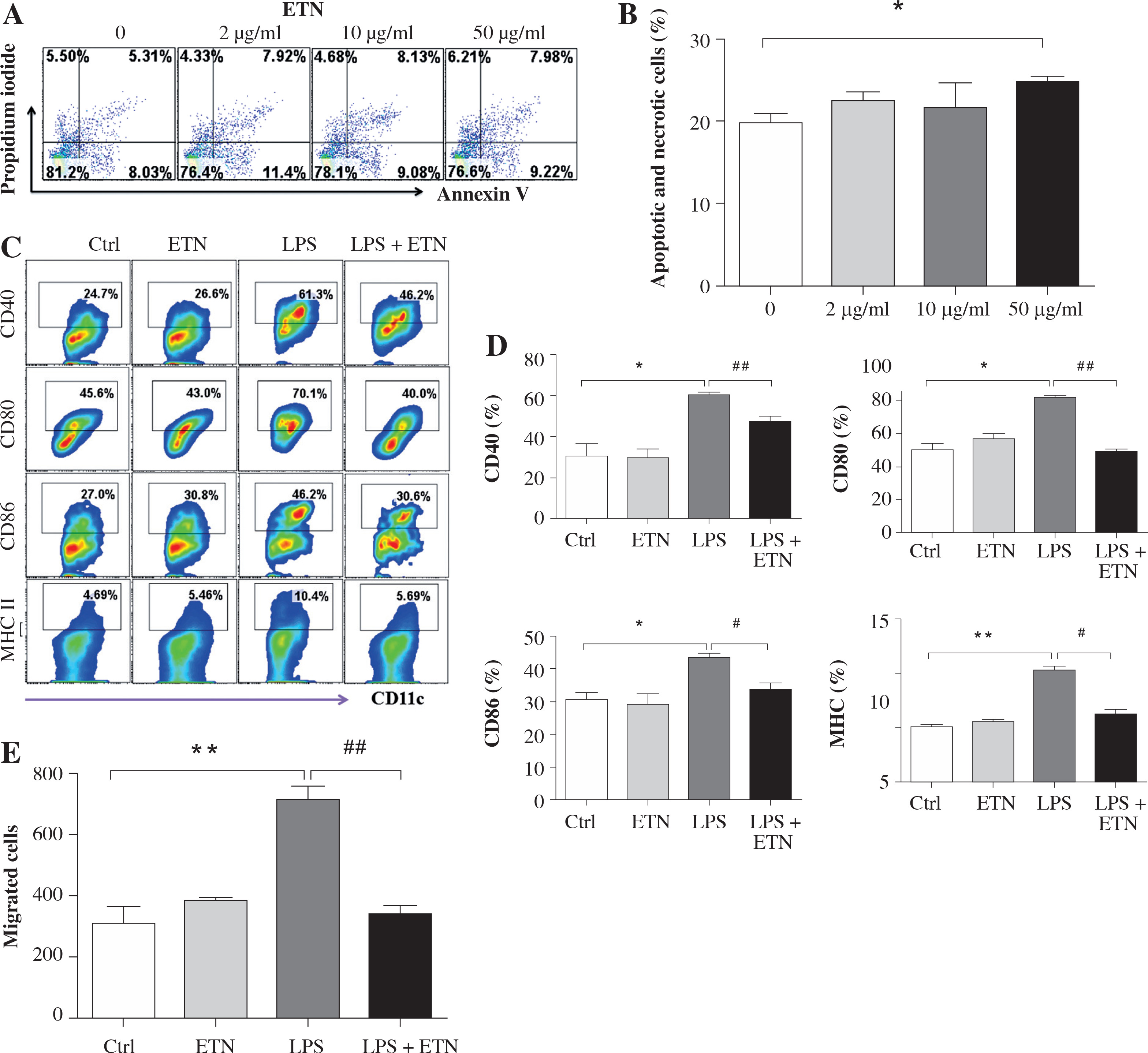 ETN efficiently inhibited maturation and migration of LPS-treated BMDCs in vitro. A, B) Bone marrow-derived DCs (BMDCs) were treated with various concentrations of ETN (2 μg/ml, 10 μg/ml, 50 μg/ml) for 24 hrs, and then stained with Annexin V-FITC/Propidium Iodine Apoptosis Detection Kit (Invitrogen, Carlsbad, CA, USA). Apoptotic and necrotic rates were determined by flow cytometry. C, D) BMDCs were treated with LPS (1 μg/ml), ETN (10 μg/ml) for 24 hrs. The expression of CD40, CD80, CD86 and MHC II (I-Aq) were determined by flow cytometry. E) BMDCs were treated with LPS (1 μg/ml) in the presence or absence of ETN (10 μg/ml) for 24 hrs. The cells were collected and plated in the top chamber, 200 ng/ml CCL21 was added in the bottom chambers of the transwell plates. The migrated DCs in the bottom chambers were harvested and counted by flow cytometry 3 hrs later. All data shown were gated on CD11c+cells. * p < 0.05, ** p < 0.01 were for the comparisons between the LPS-treated and untreated DCs, # p < 0.05, ## p < 0.01 were for the comparisons between the ETN-treated and untreated LPS-stimulated DCs