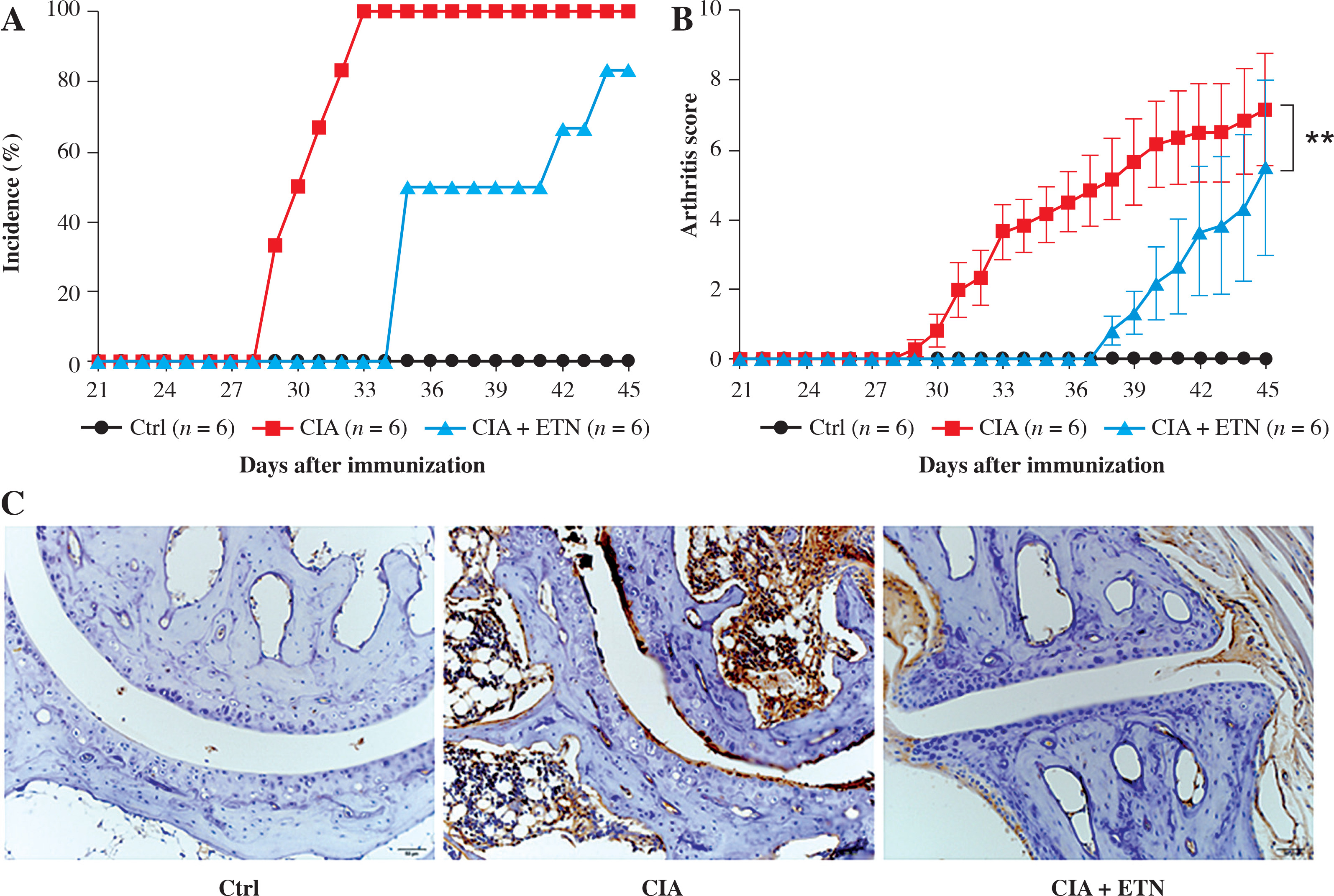 Mice were divided into the control group, CIA group (arthritic mice injected with saline), and ETN + CIA group (CIA mice intraperitoneally injected with 5 mg/kg ETN every 3 days from day 21 to 45).